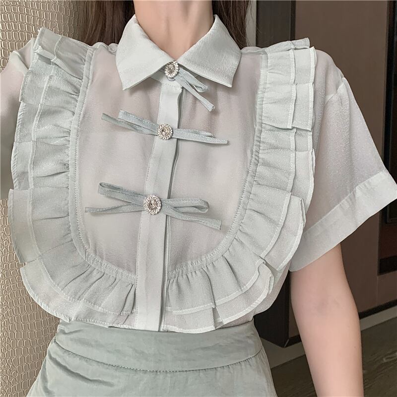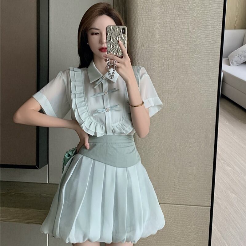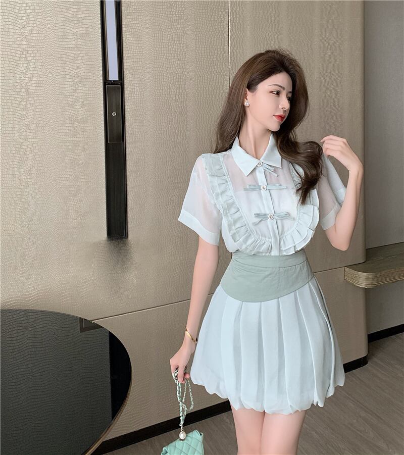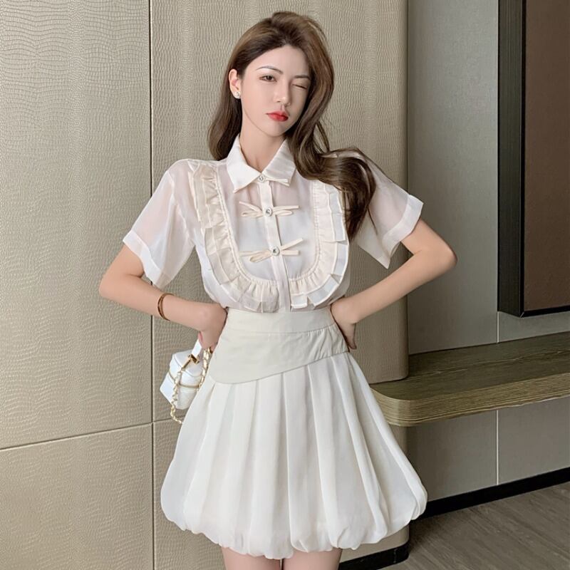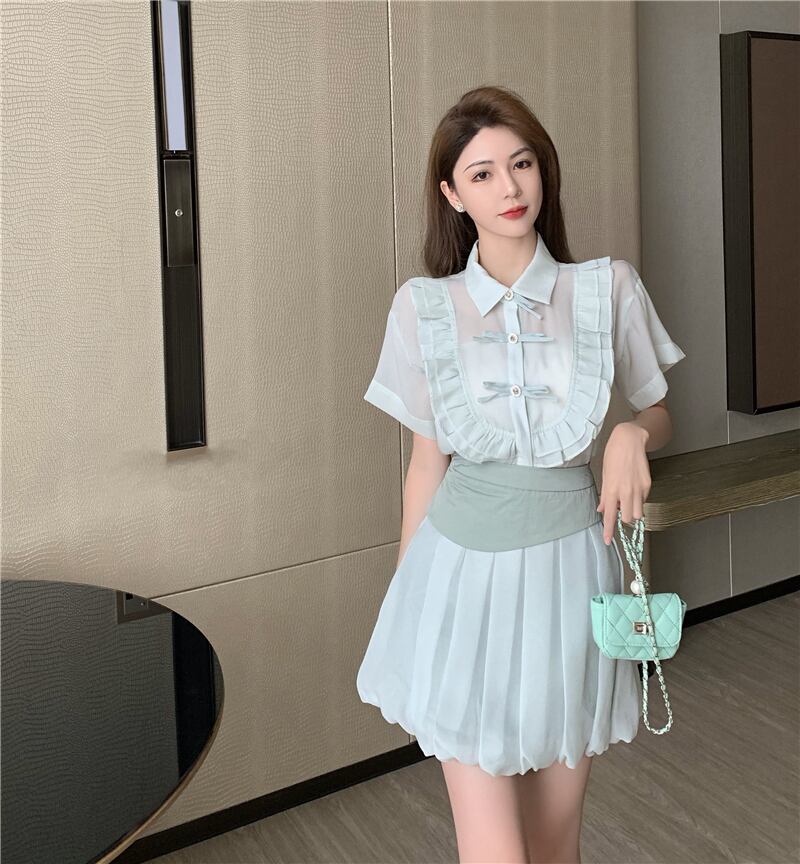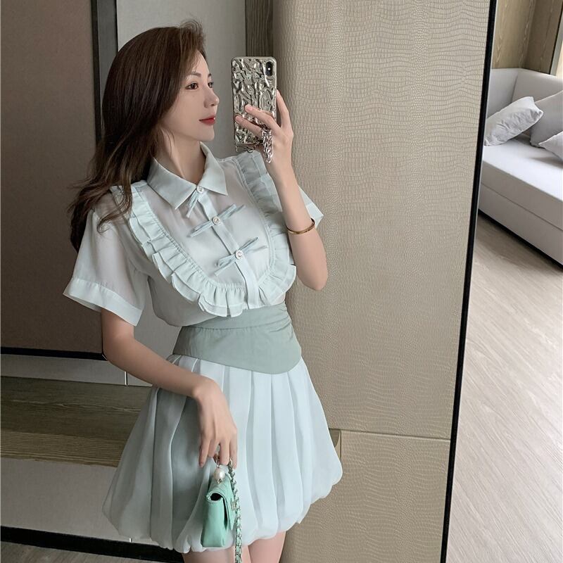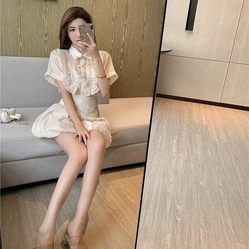レディース夏服スタンダードボタンリボン半袖スリーブハイウェストウェストスカート ショート レトロ ハーフスリーブ 夏物 ウエスト YY75833492673
