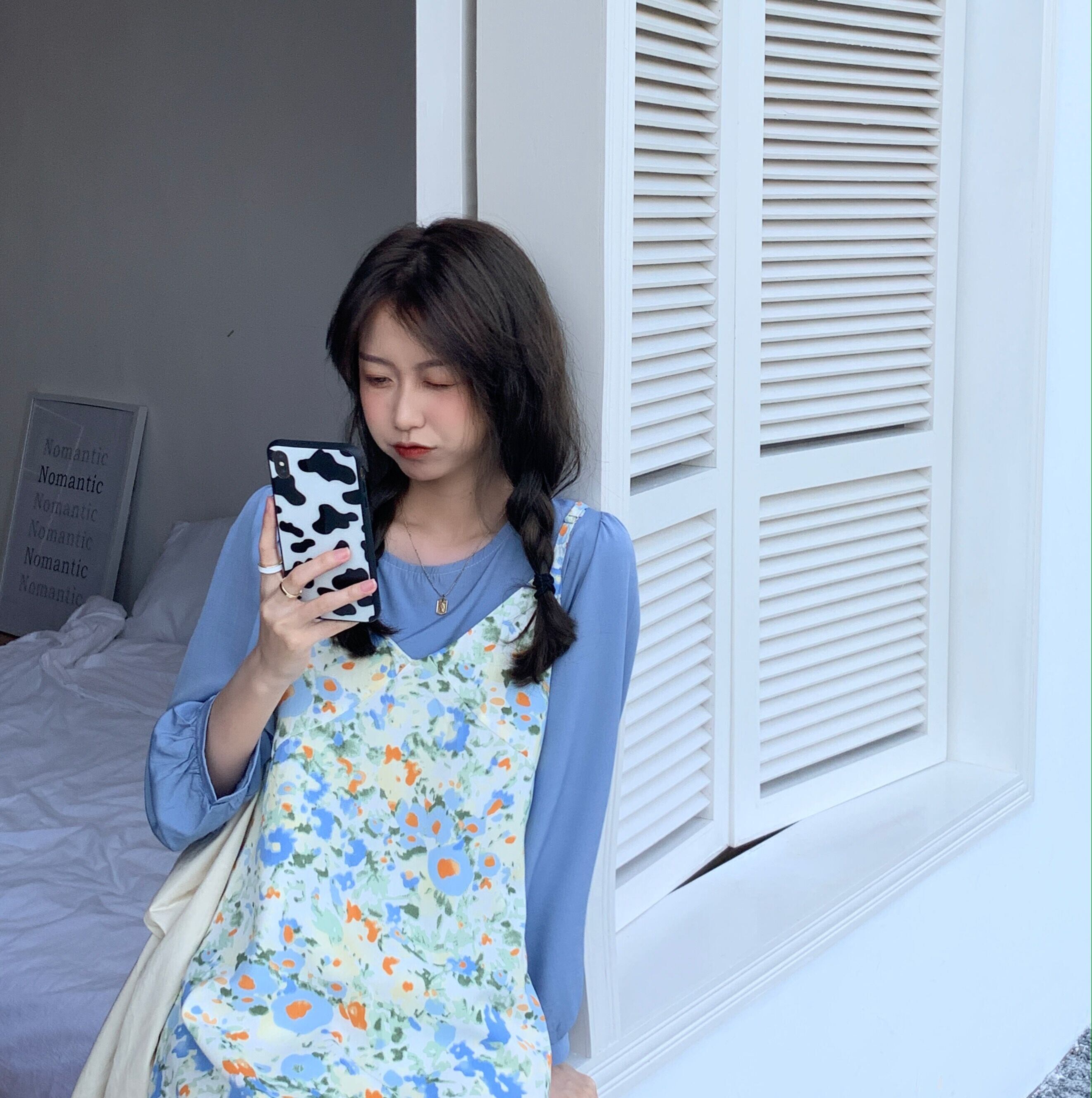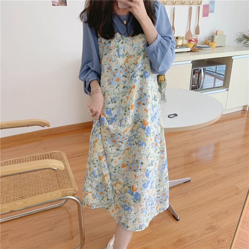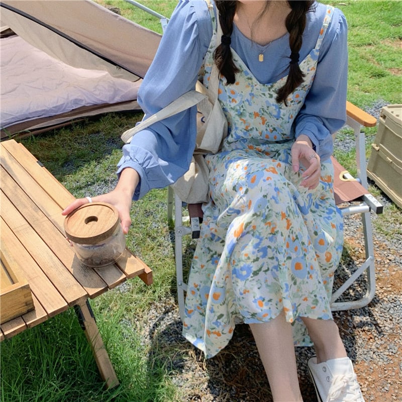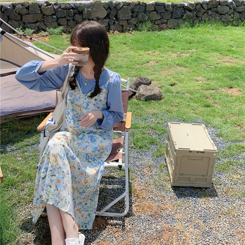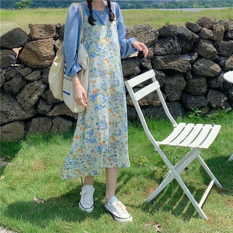 色:ブルーシフォンシャツ,油絵フローラルサスペンダースカート