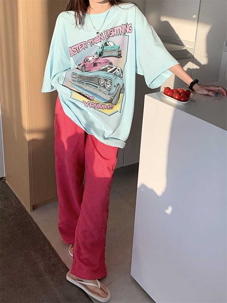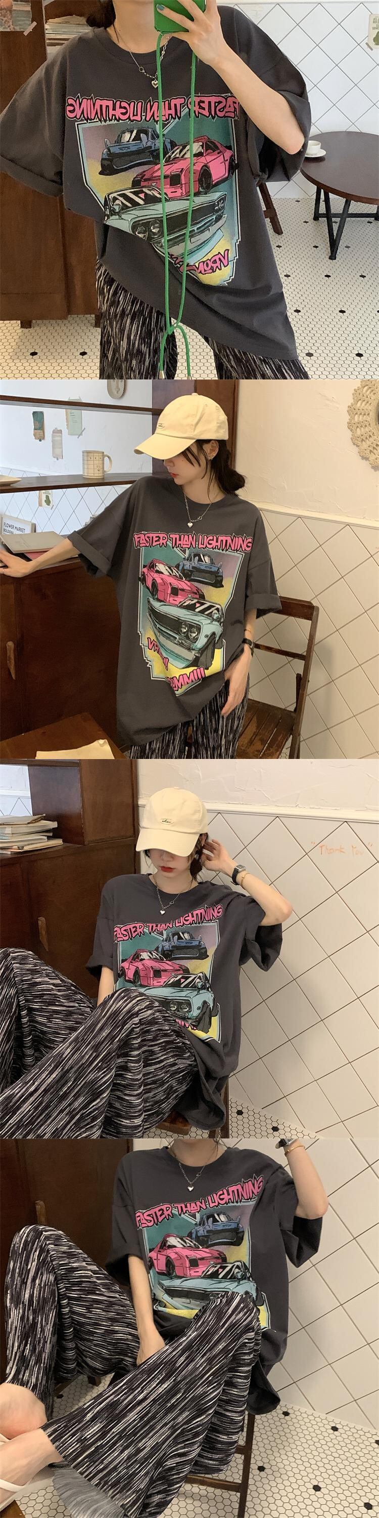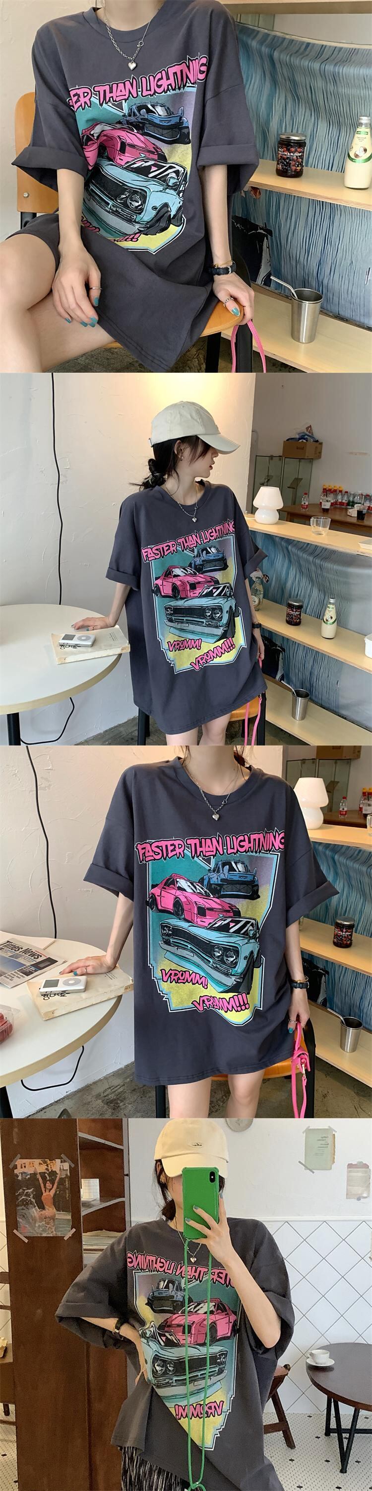 プリントTシャツレディース夏服薄手ラウンドネックルーズトップス 夏物 Oネック ミドル丈 YY538174054
