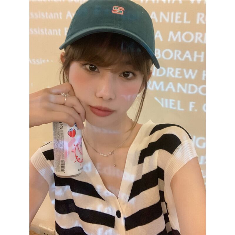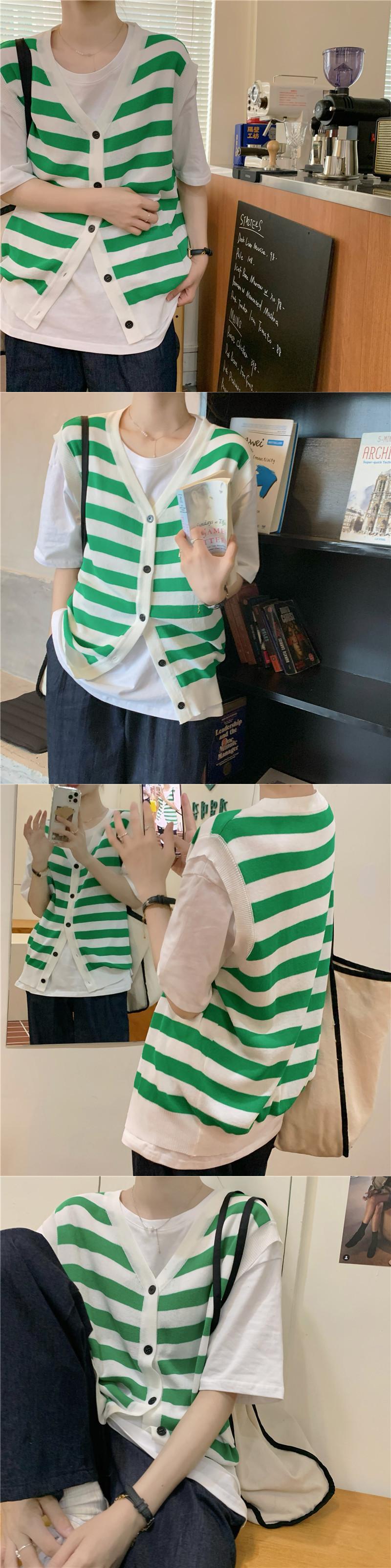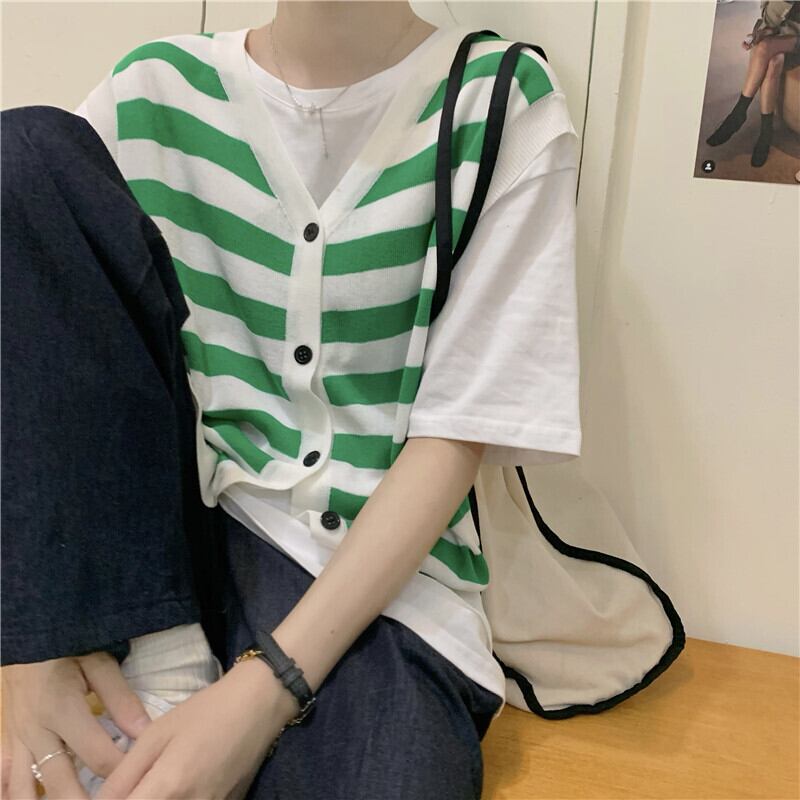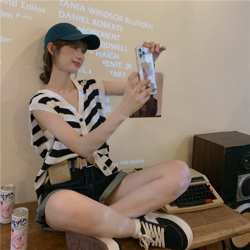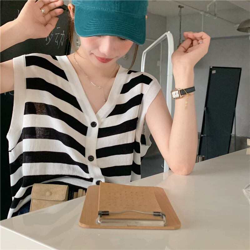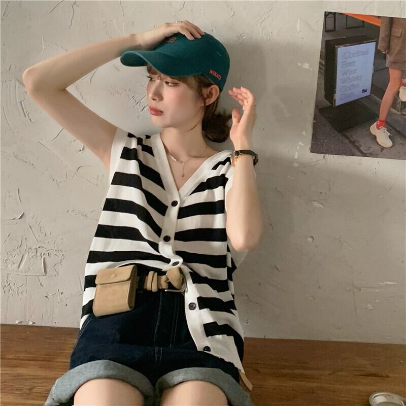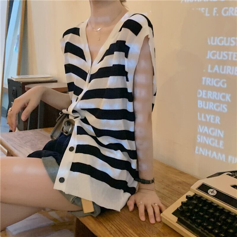 ストライプニット夏服薄手ノースリーブトップス 夏物 ウエスト YY34531438556
