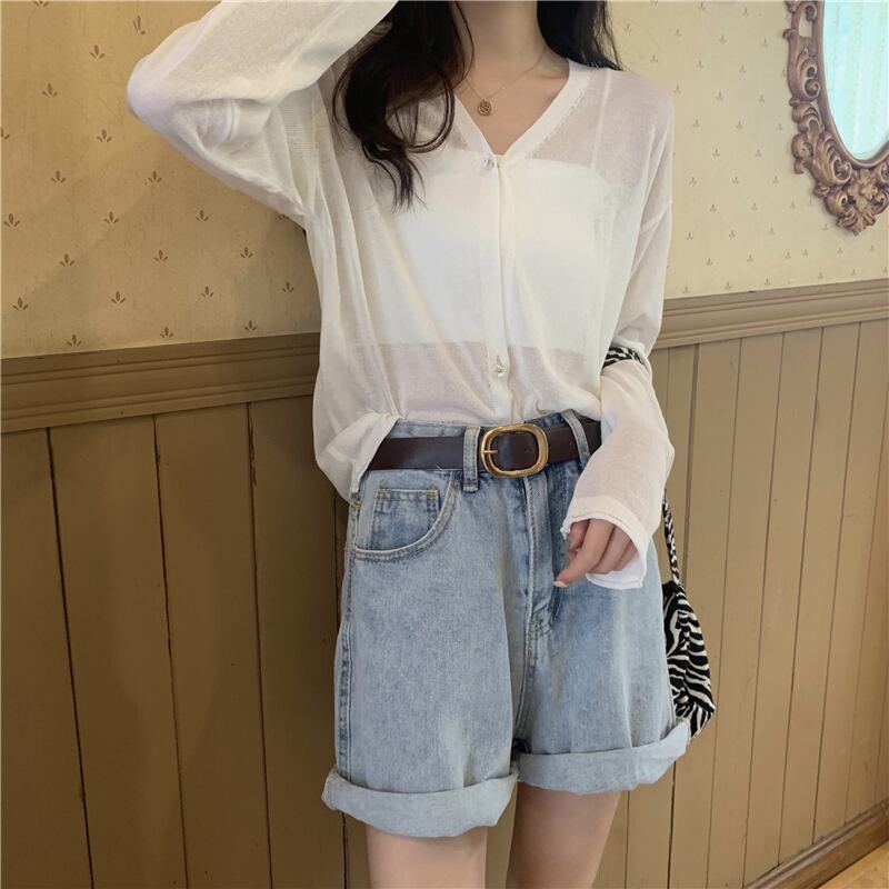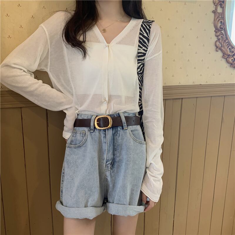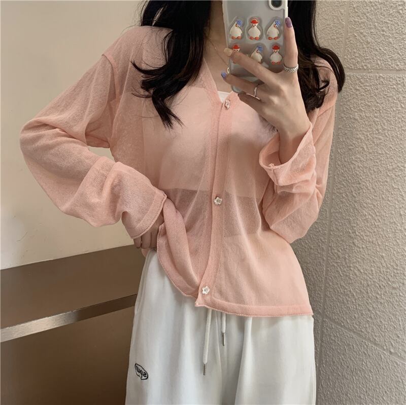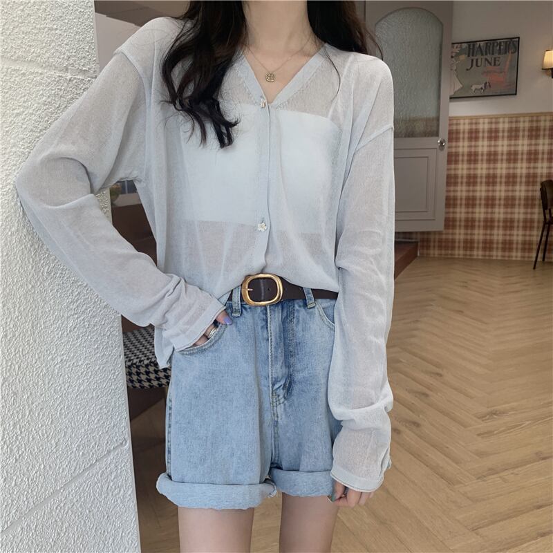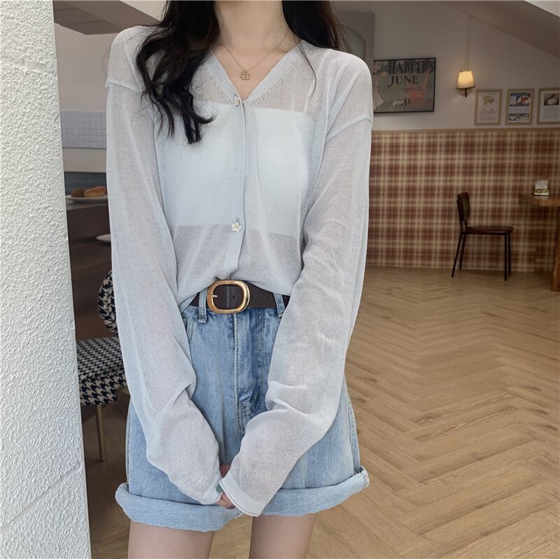 ルーズセーター 夏服薄手スタイルVネックカーディガントップス ロング 夏物 シルク 長袖 YY82004920815
