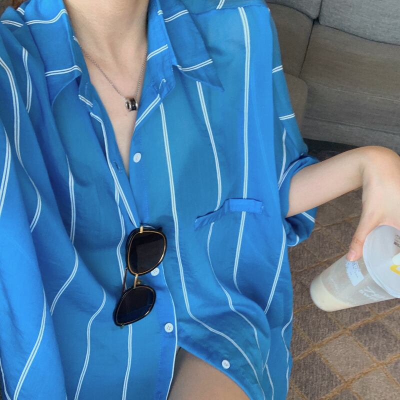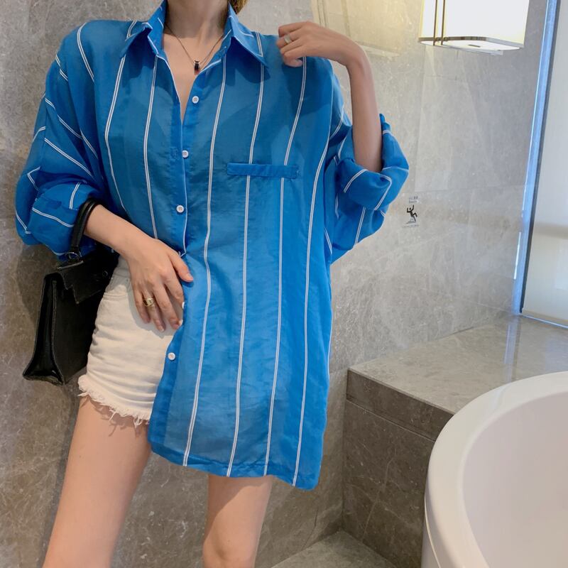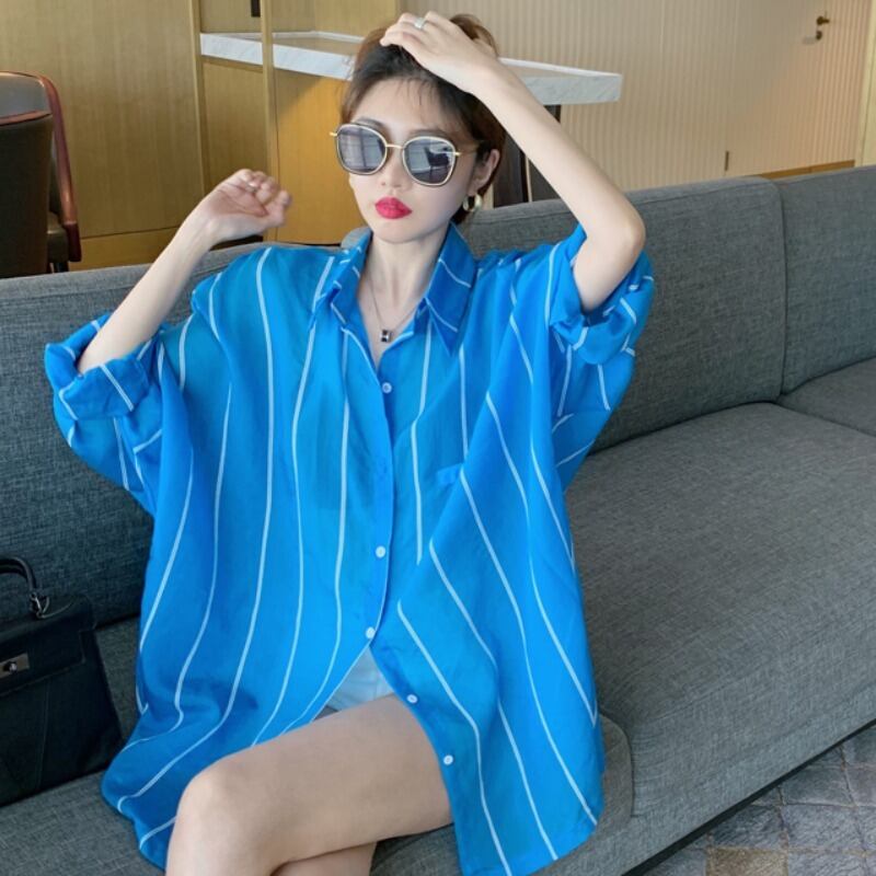 ブルーシャツ 夏服スタイルストライプ薄手ルーズトップス ロング 夏物 長袖 ミドル丈 YY22477590128