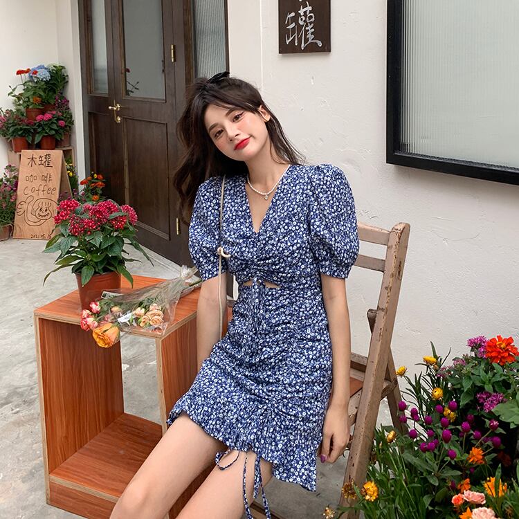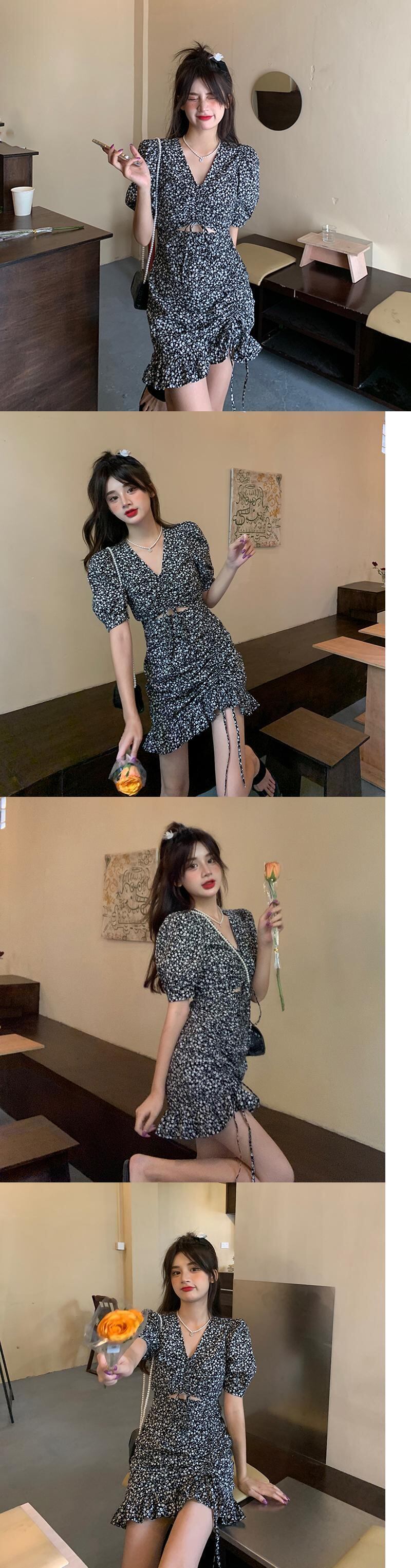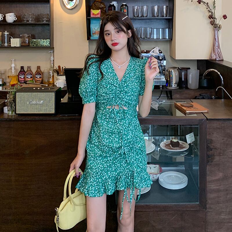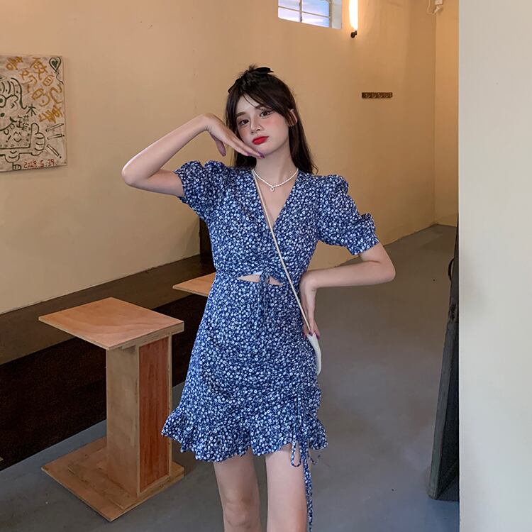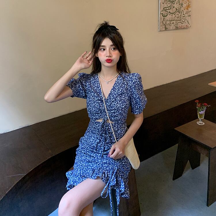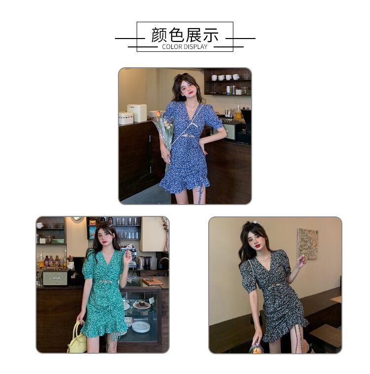 Vネックスリーブフローラルワンピース夏服スリムショートスカート 夏物 花柄 SYJ87866120363