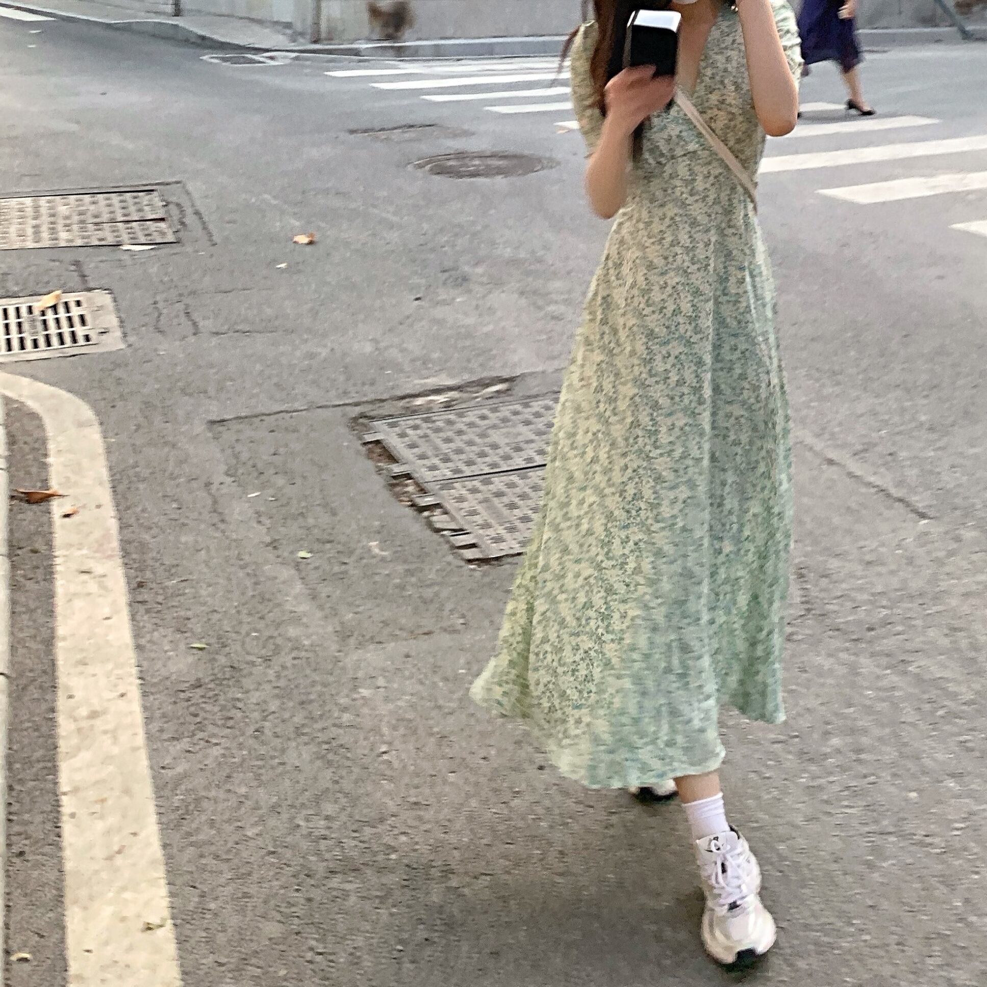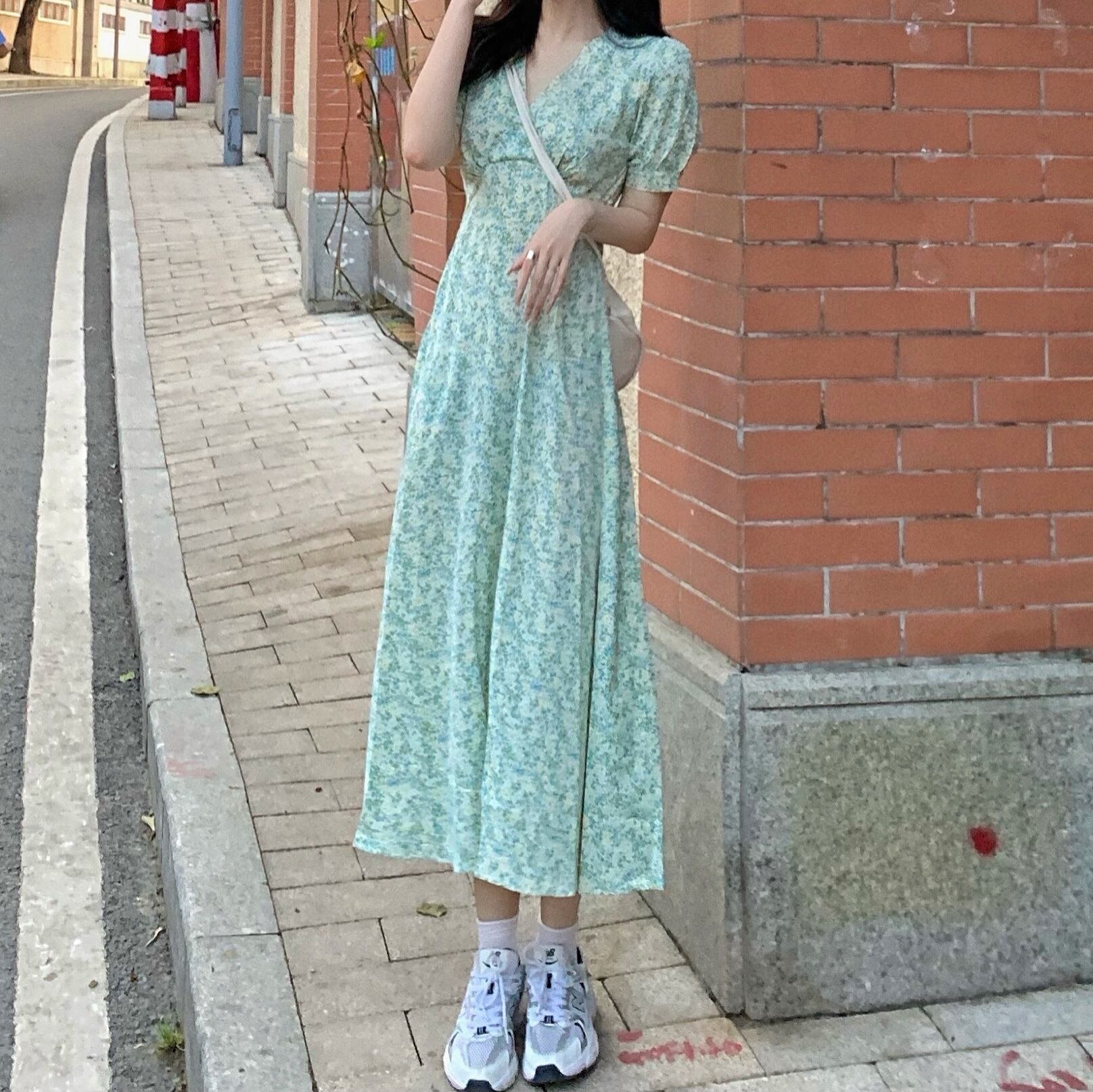 Vネックスリーブフローラルワンピース夏服スタイルロングスカート 夏物 花柄 SYJ52696571439