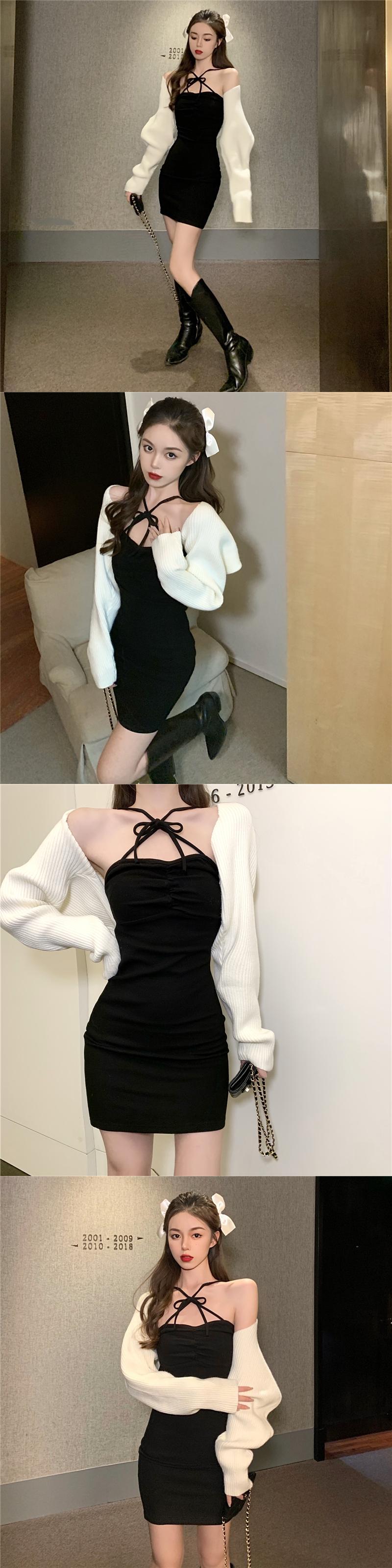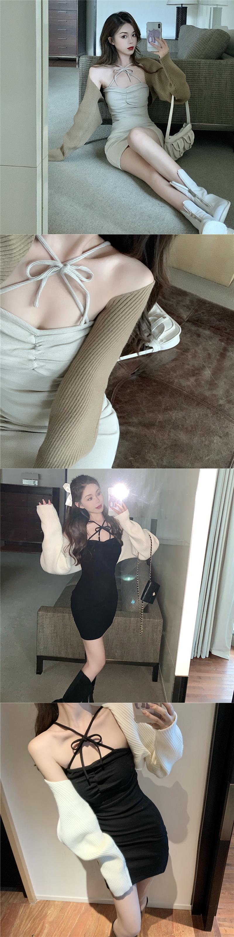 色:カーキセーターコート,白いセーターコート,アプリコットドレス,ブラックサスペンダースカート