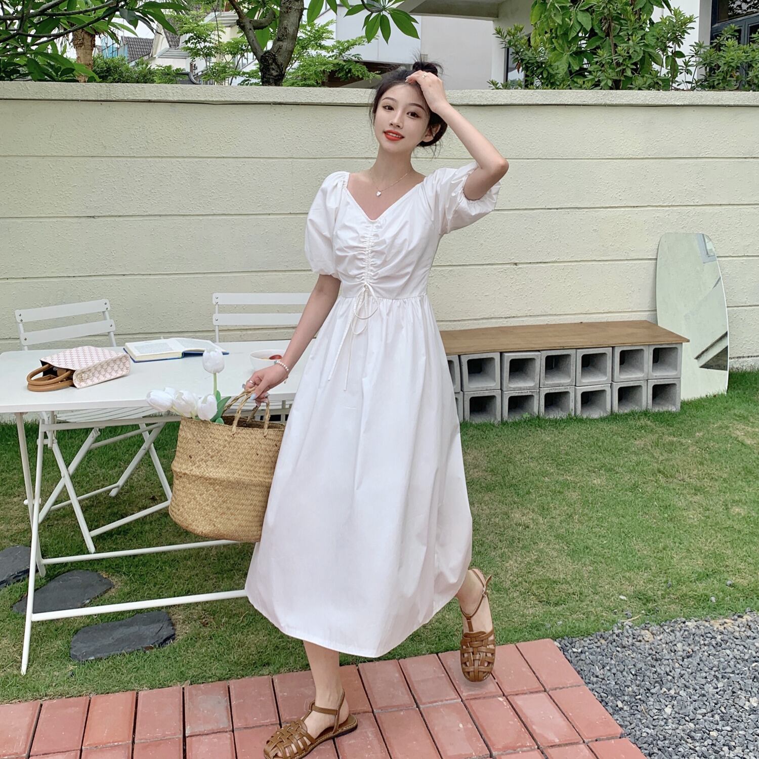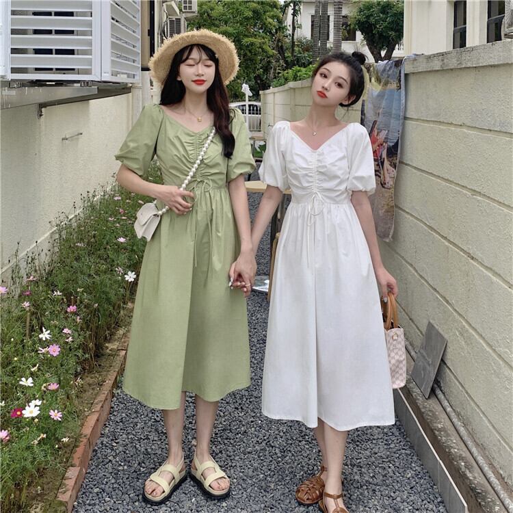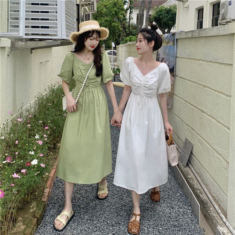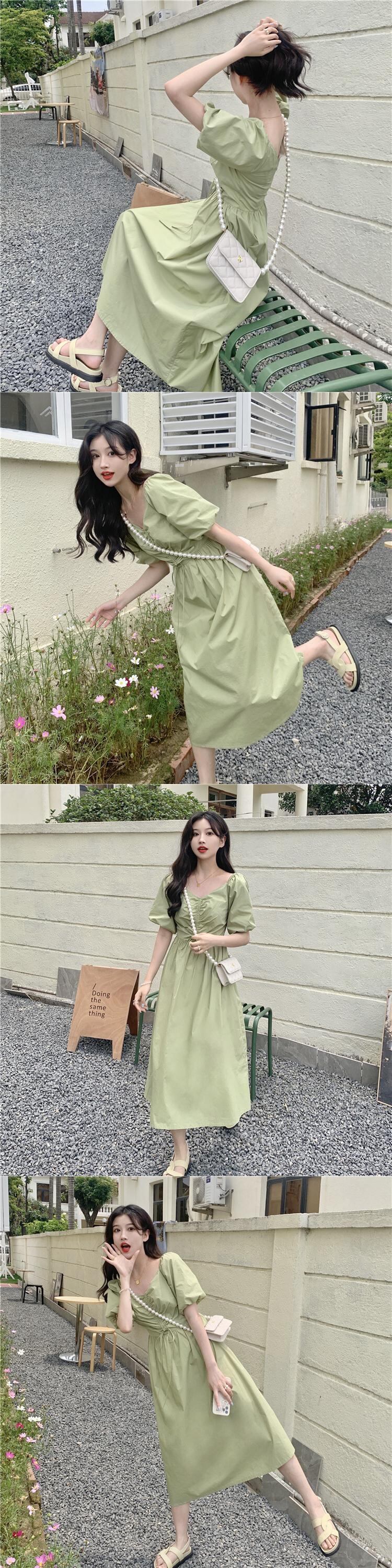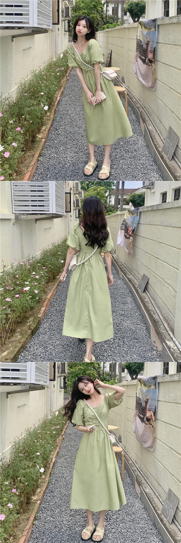 Vネックギャザープリーツウェストワンピースレディースソリッド カラーロングスカート ソリッドカラー パフスリーブ ウエスト YY22745905133