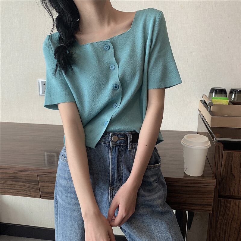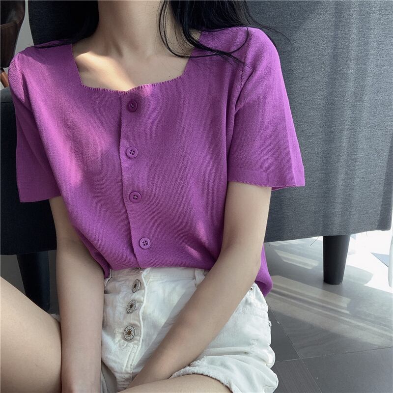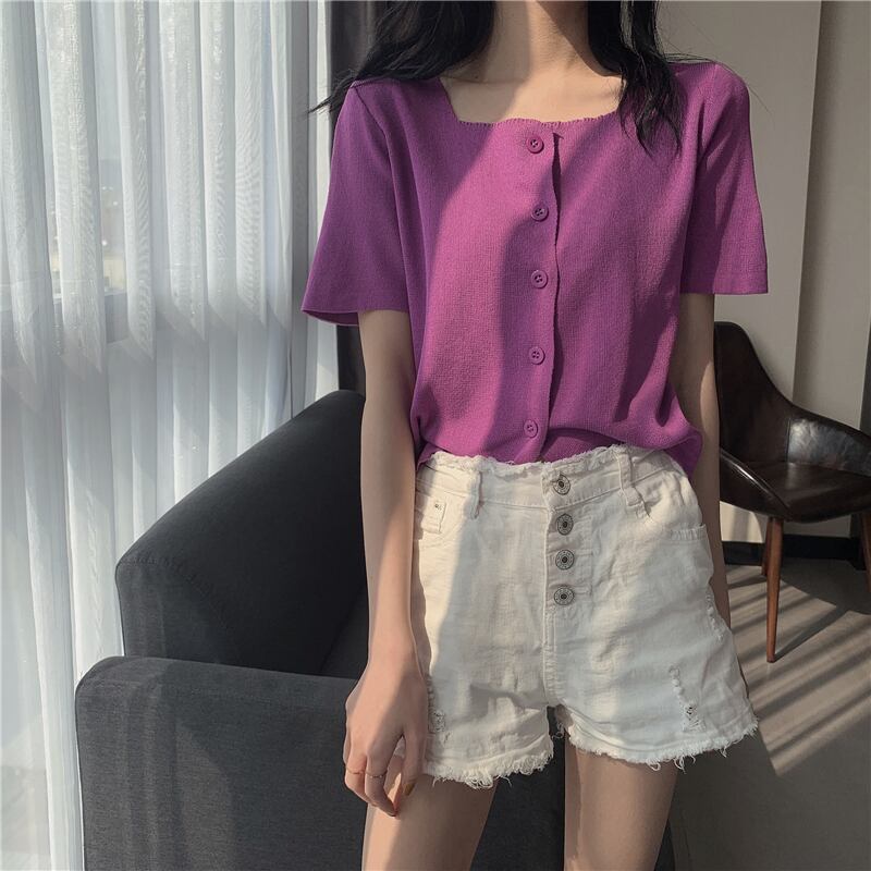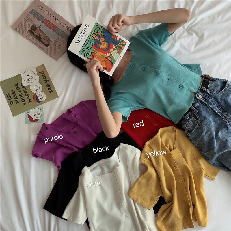 韓国ファッションスタイルトップス 夏服ニットセーター カラー薄手ゆったりシャツ 半袖スリーブTシャツカーディガン ショート ハーフスリーブ 夏物 スクウェア YY70907886597