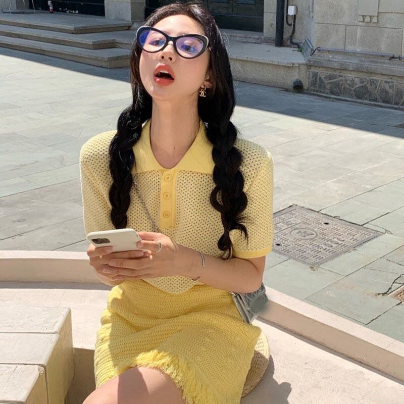 夏服スタイルイエロールーズシャツ ニットトップス ハイウェストウェストスリムスカート レディース 大人ガーリー スウィート キュート カジュアル 夏物 ウエスト YY97805947449