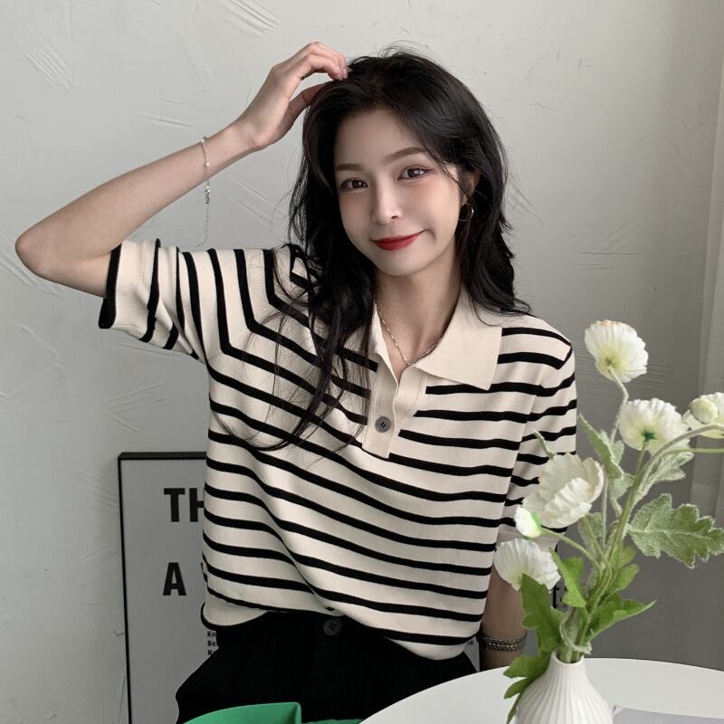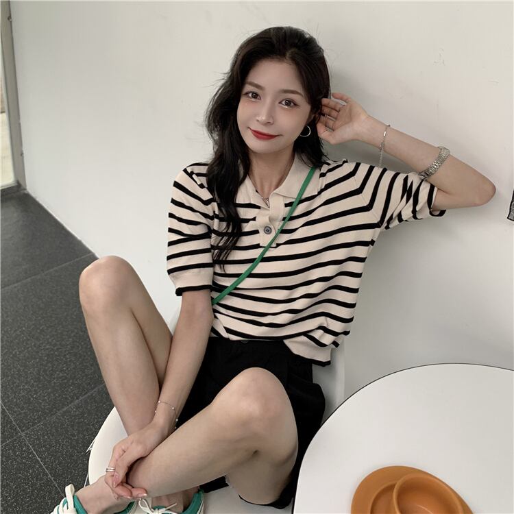 ストライプカラー半袖スリーブTシャツ夏服薄手ニット ショート ハーフスリーブ 夏物 シルク YY13566176043