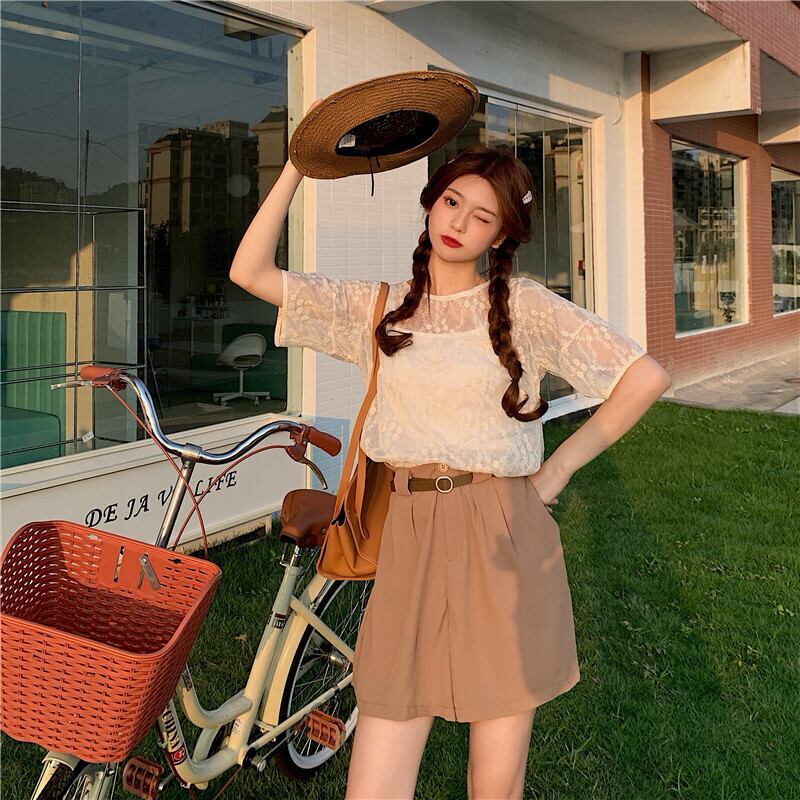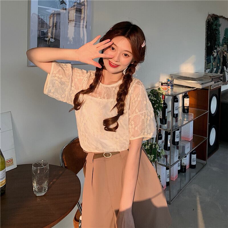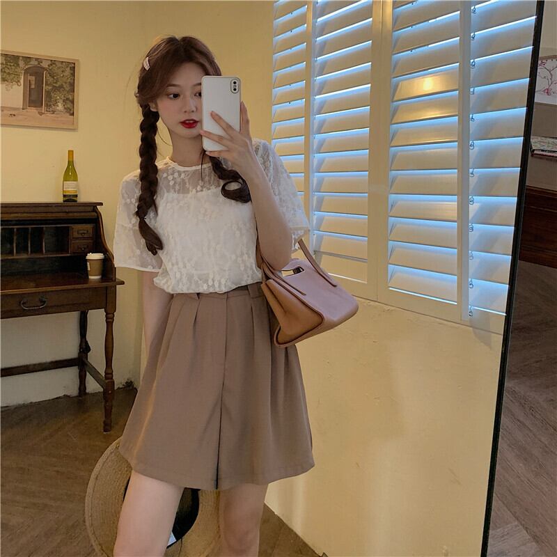 ソリッド カラー刺繍レーストップス シャツ カジュアルハイウェストパンツ ソリッドカラー ウエスト YY70727121238