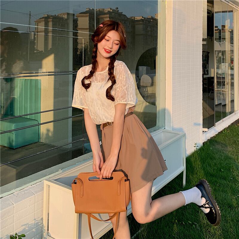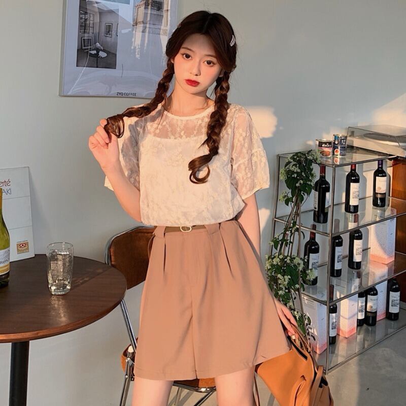 色:2つの白いサスペンダー+レースのトップス,キャメルパンツ