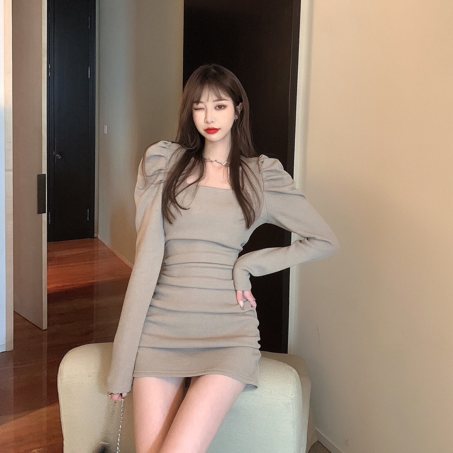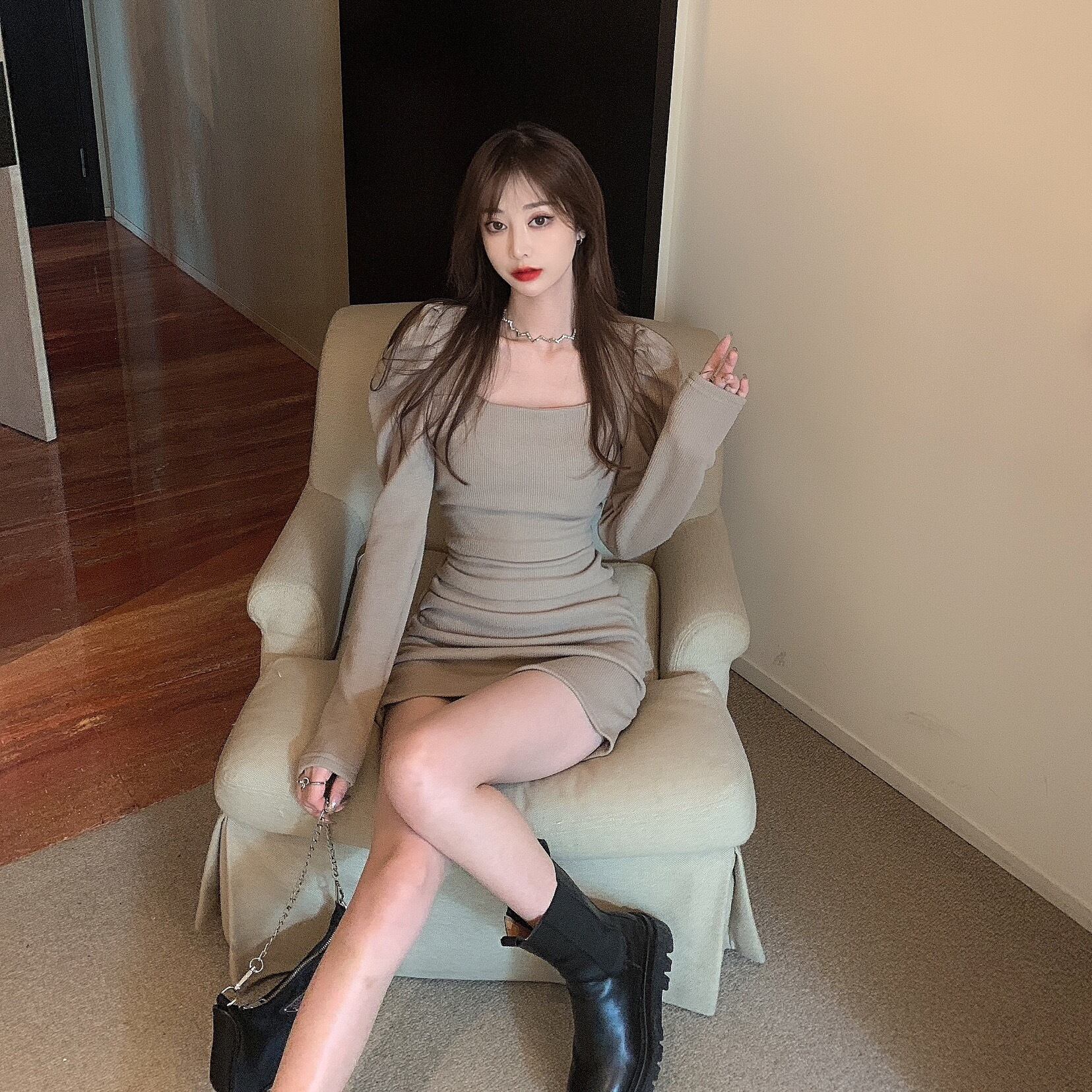 ニットワンピースブラックスカート スプリング ロング 春物 スクウェア 長袖 YY56356714458