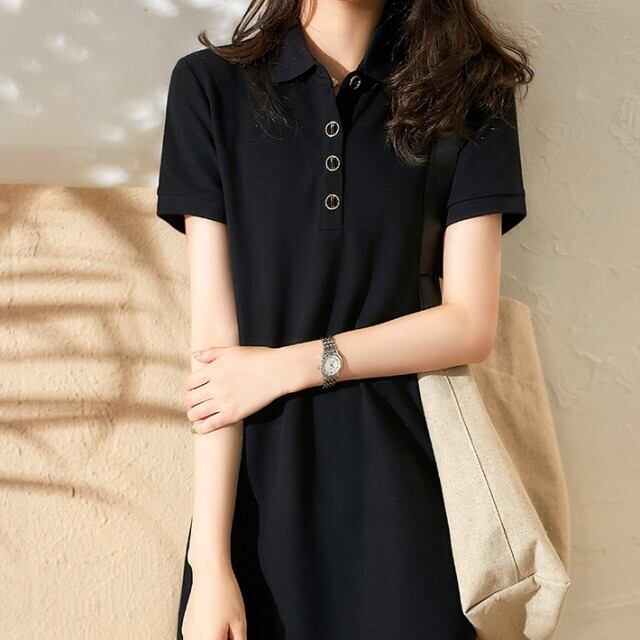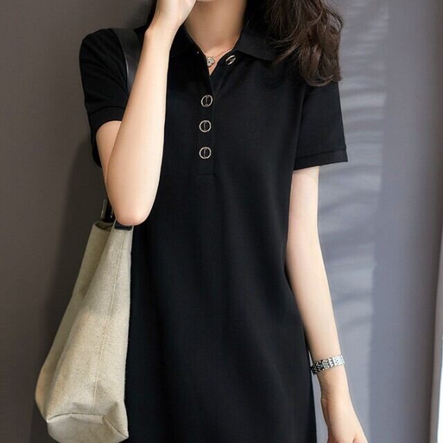 ポロシャツ ロング丈 半袖 レディース ワンピース POLO襟 黒 トップス ティーシャツ tシャツ ワンピ ひざ丈 薄手 ロング丈 カジュアル 春 夏 韓国ファッション