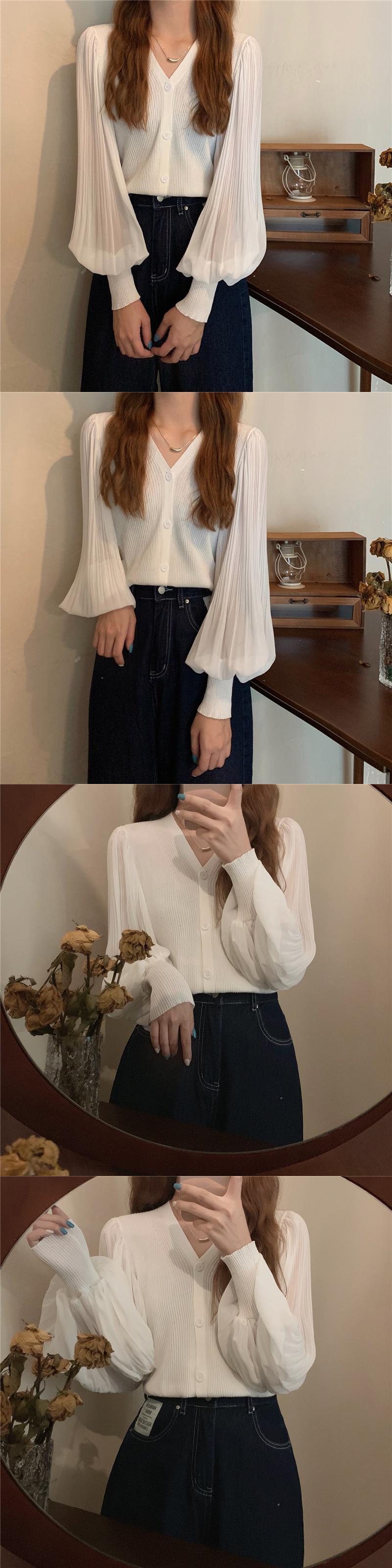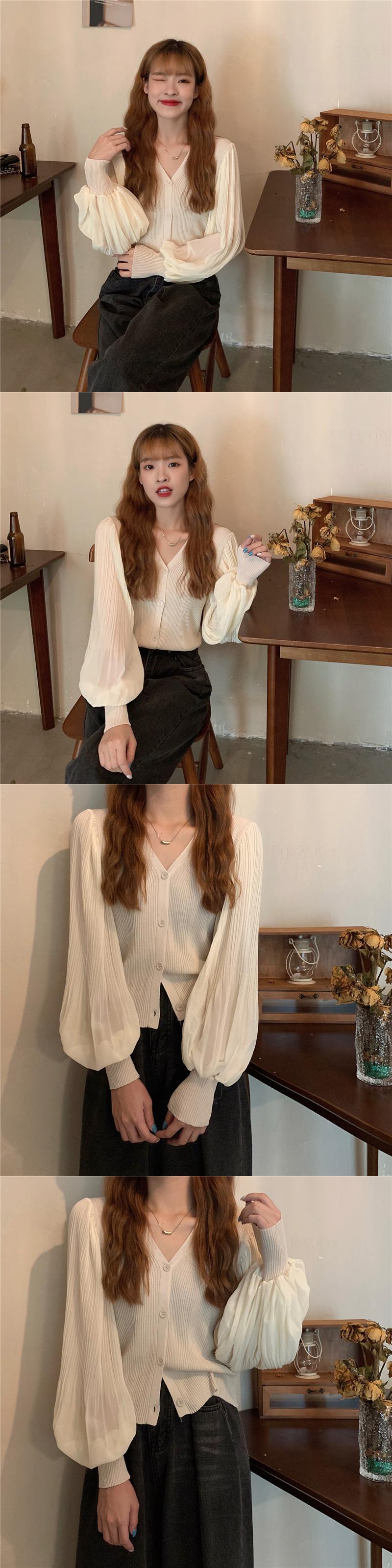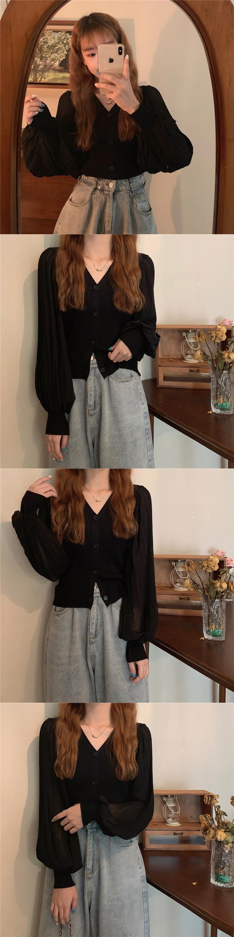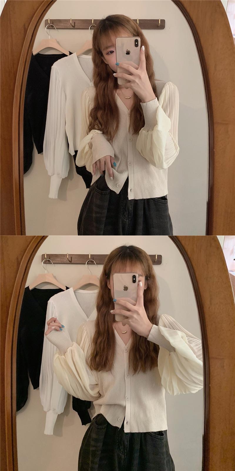 ニットセーター レディース秋物薄手スタイルVネックスリーブシフォンカーディガントップス ランタンスリーブ オータム ステッチ ワンナンバー7975929558
