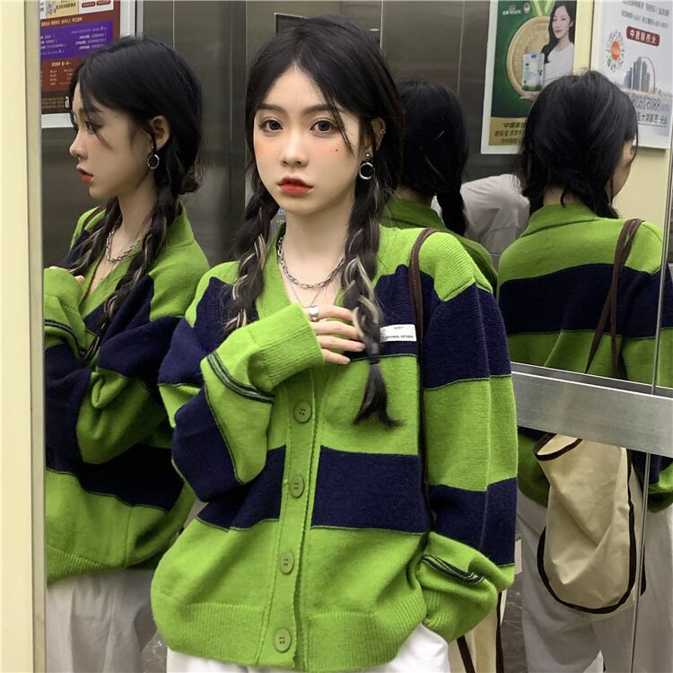 グリーンストライプニットカーディガン秋物Vネックセーター コート 韓国ファッションルーズトップス オータム MONROE45667706760