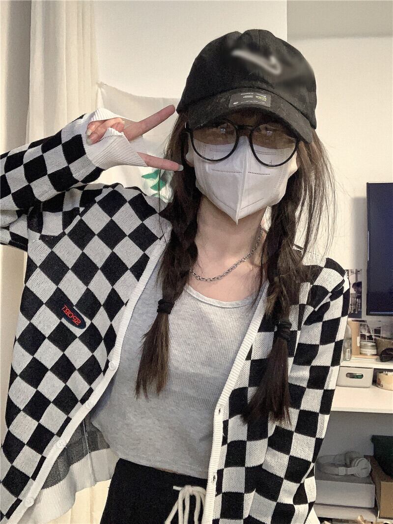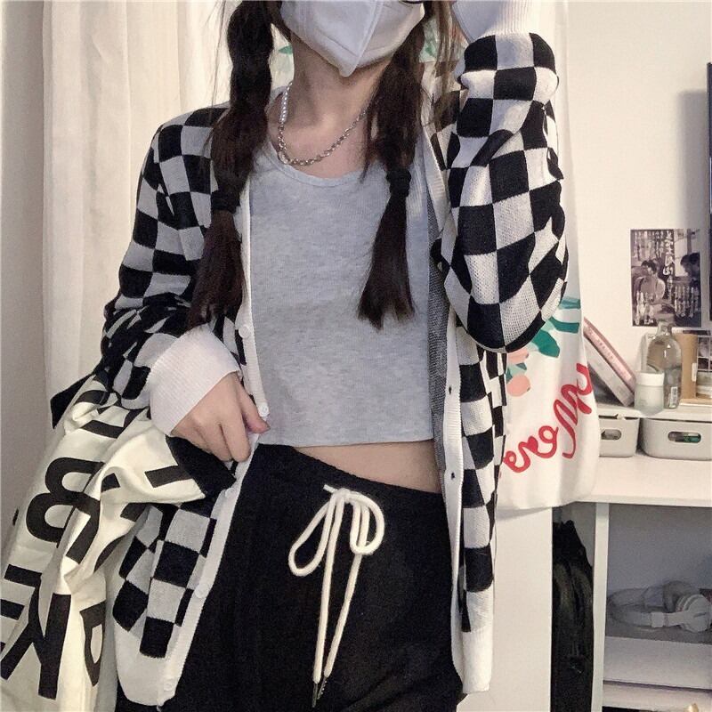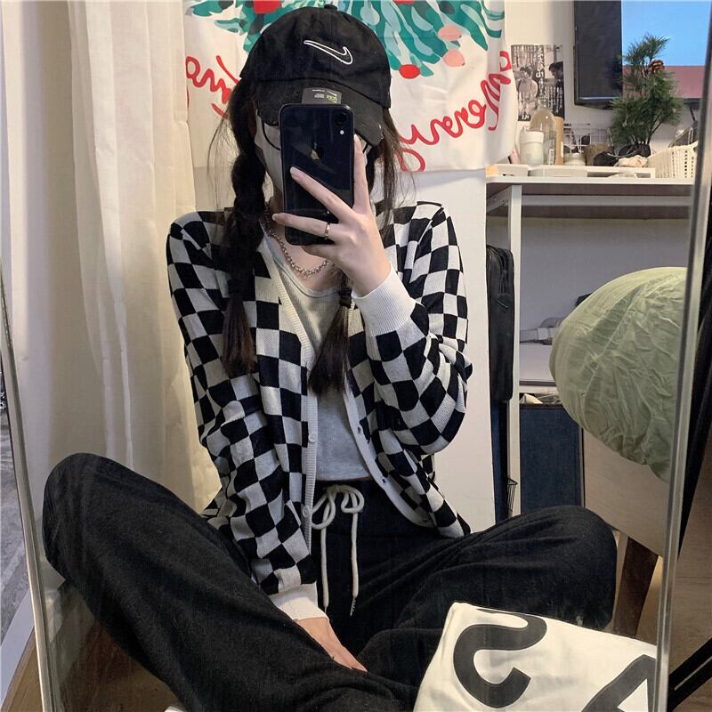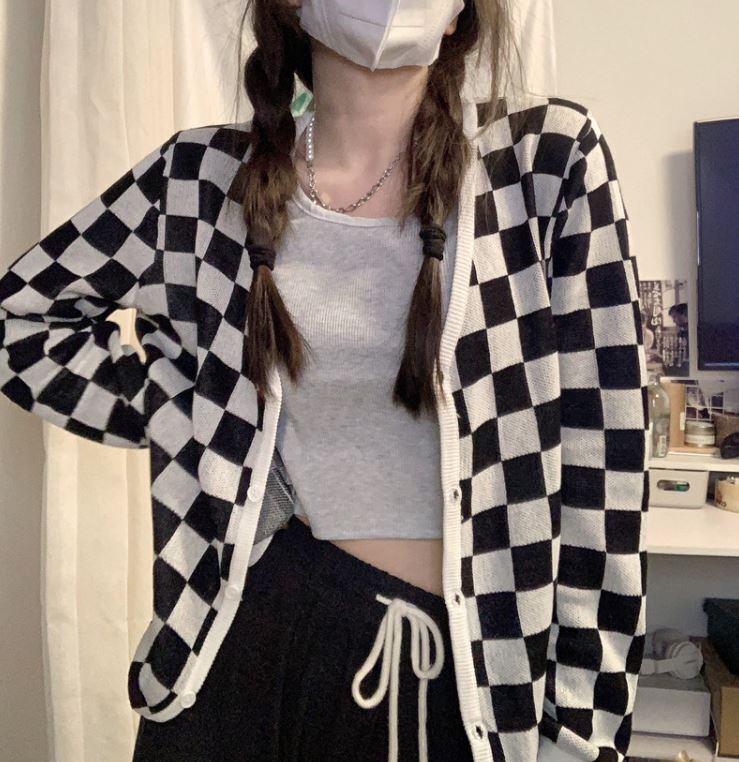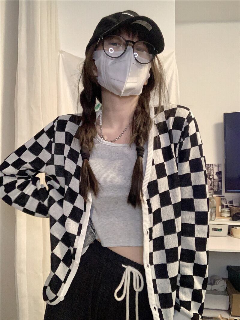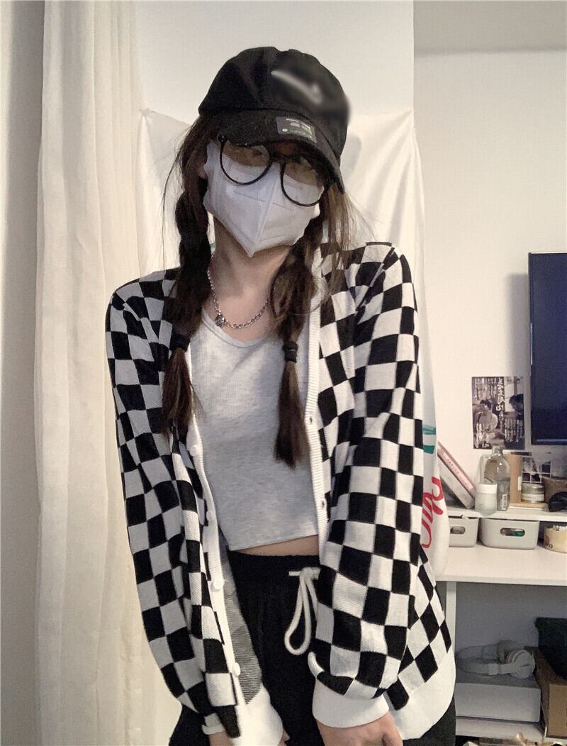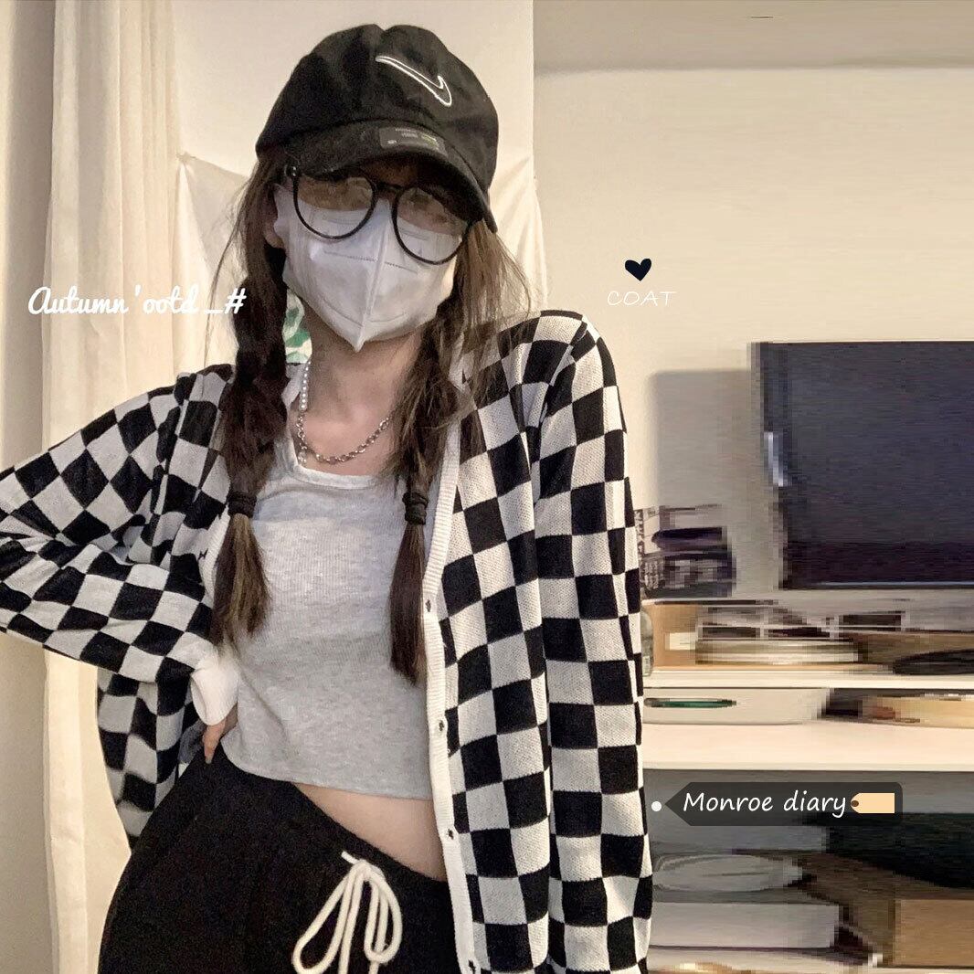 スタンダード格子柄ニットカーディガンスプリング秋物薄手セーター ジャケット スタイル ロング レトロ 春物 オータム 長袖 MONROE9121499305