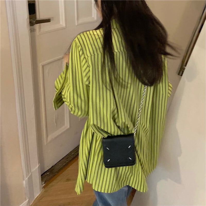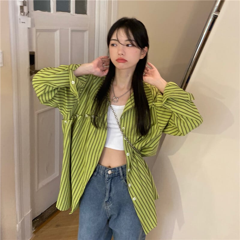韓国ファッションスタイルグリーンストライプスタンダードシャツ ブラウス ジャケット 秋物トップス レトロ オータム MONROE14223742391