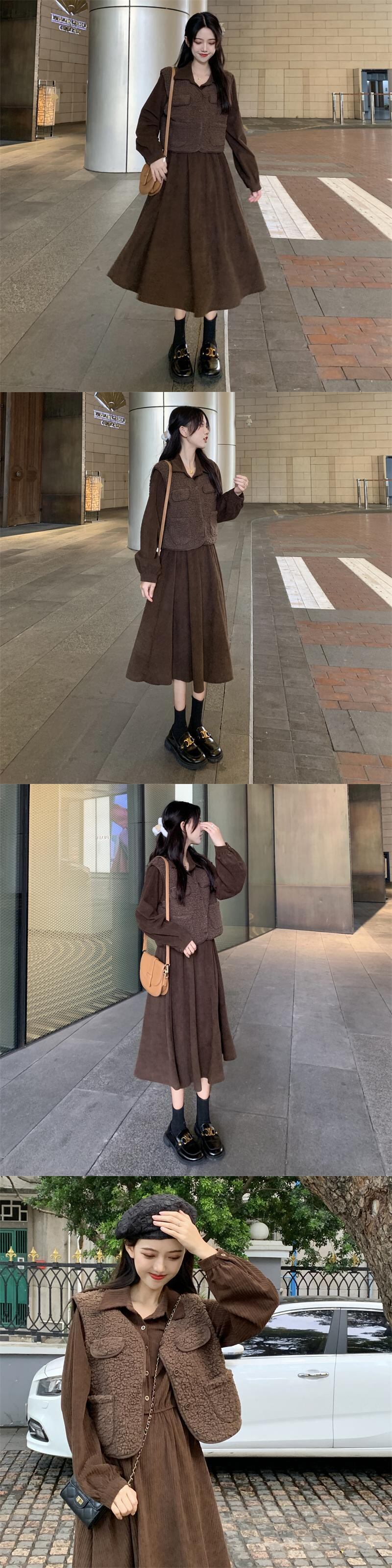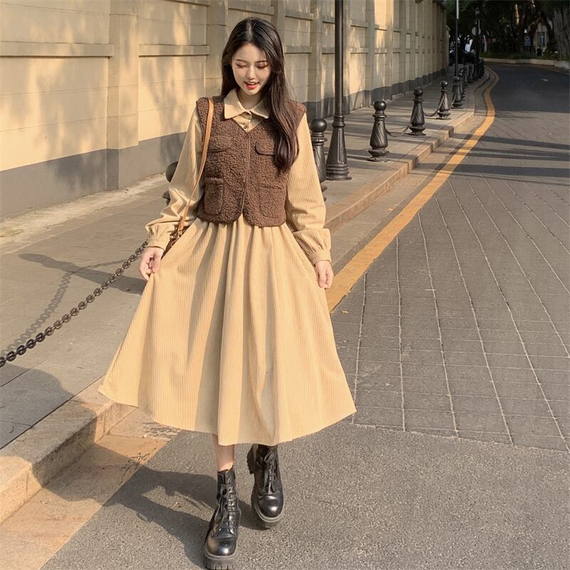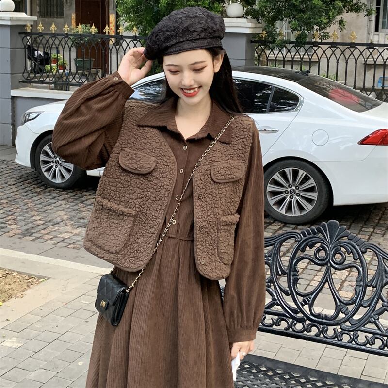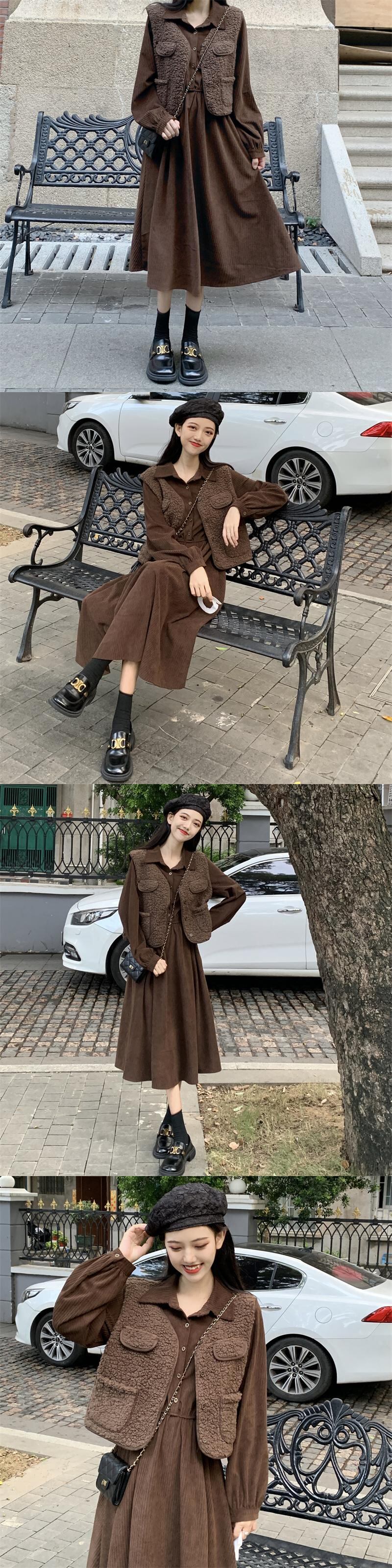 色:ブラウンベスト,カーキ色のドレス,茶色のドレス