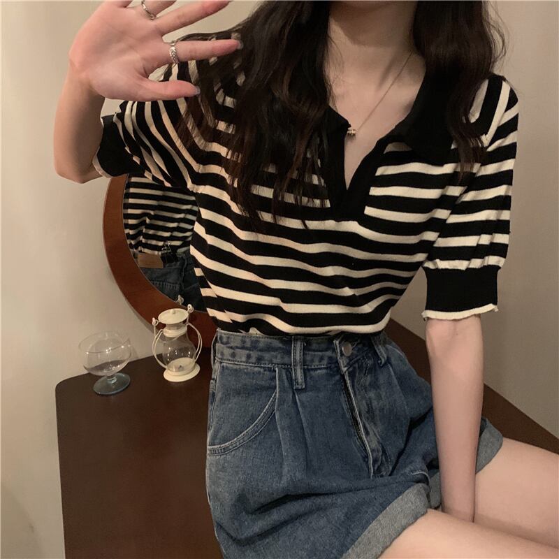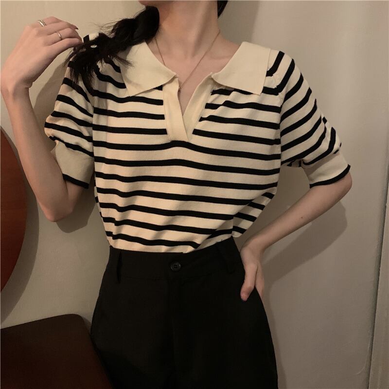 スタンダードストライプニットセーター 夏服ルーズスタイルカラー レトロ 夏物 SPM72695079645