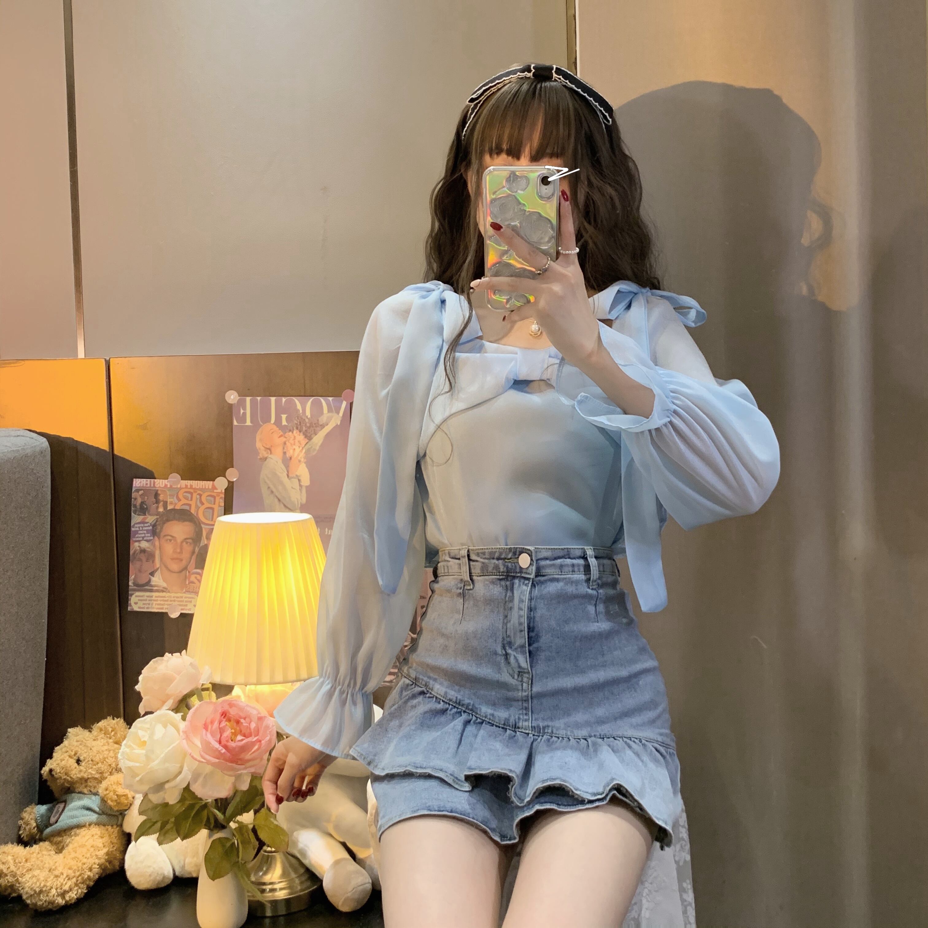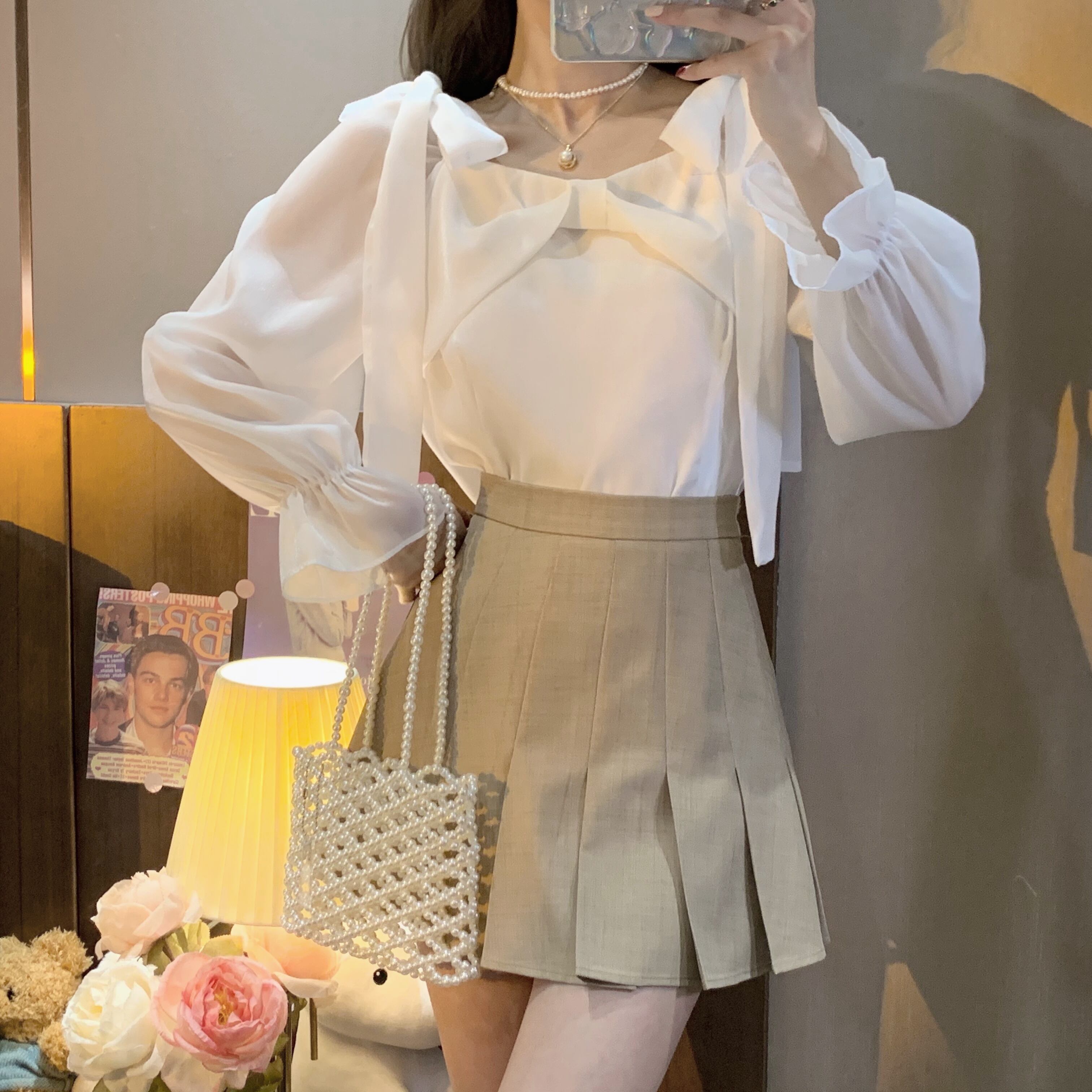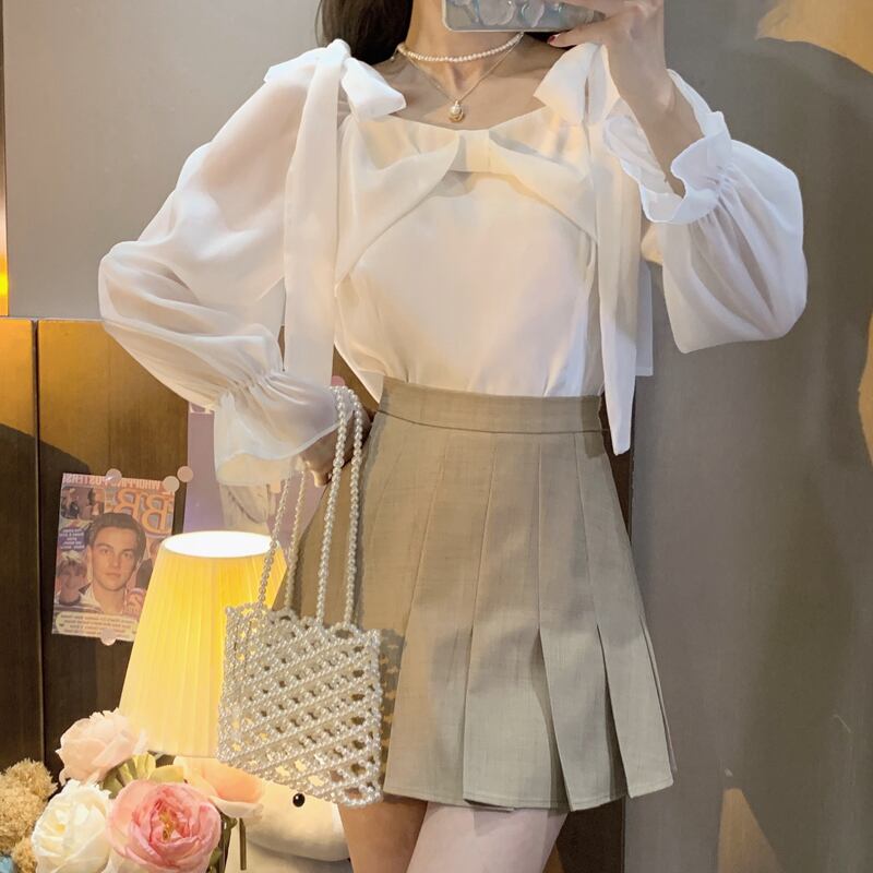 リボンカラーシャツ スプリングホワイトショートトップス ロング 春物 スクウェア 長袖 SPM32931763816