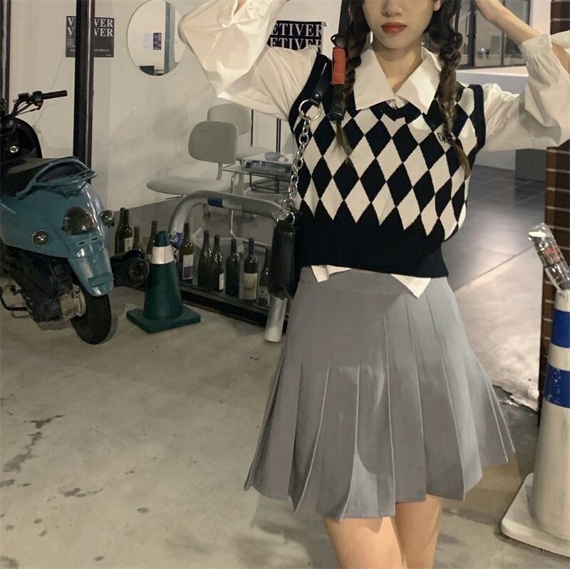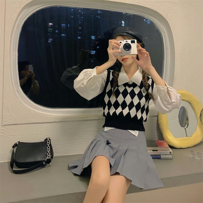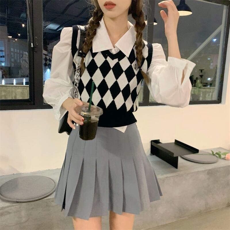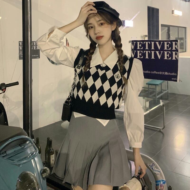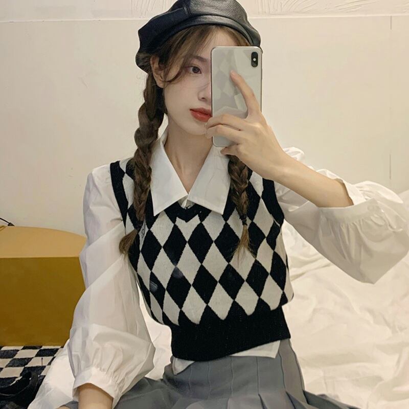 色:白いシャツのワンピース,ひし形のベスト,リンジカーディガンシングルピース