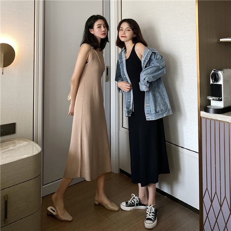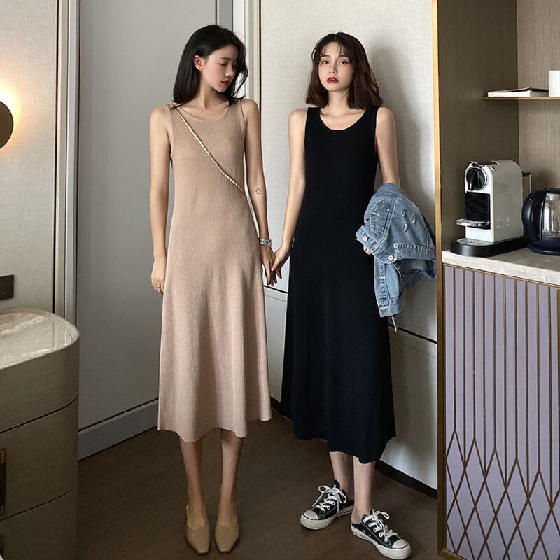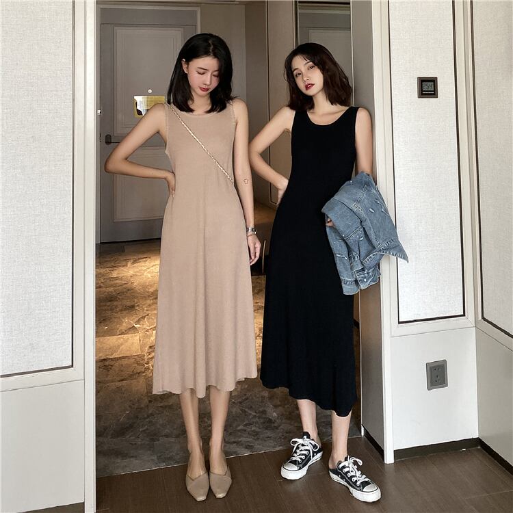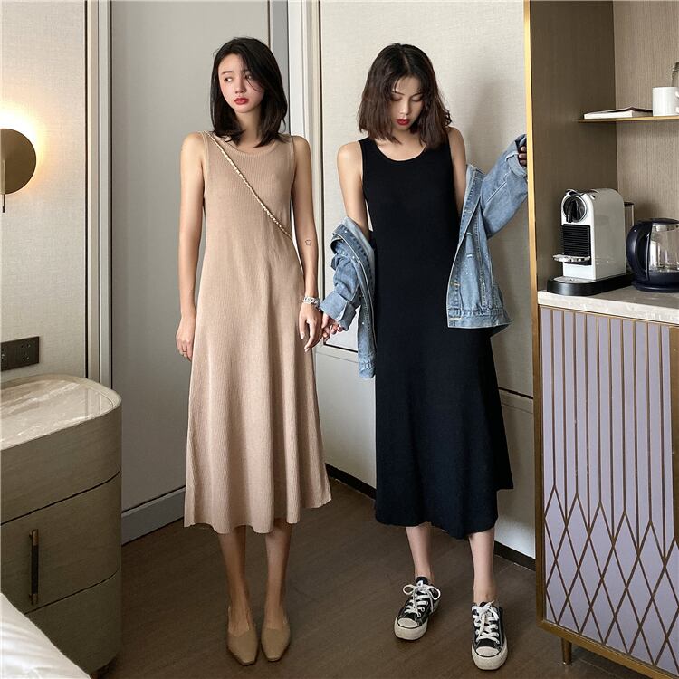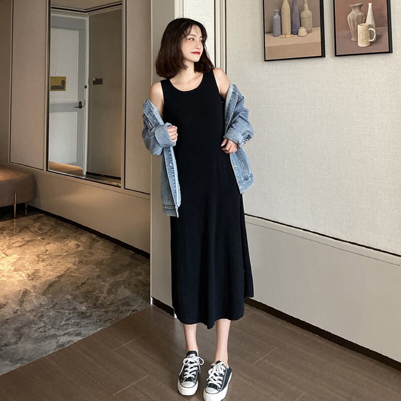 ノースリーブワンピーススプリング秋物スリムフィットゆったりスカート ブラックニットロング 春物 オータム SYJ35219203460
