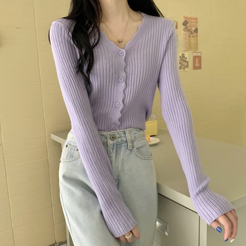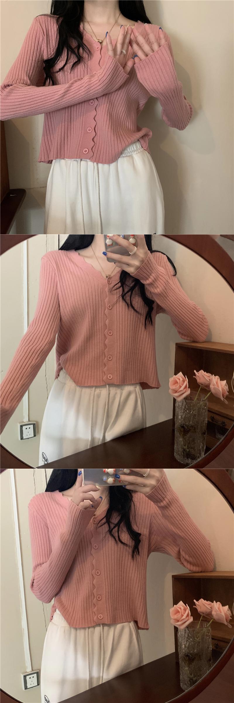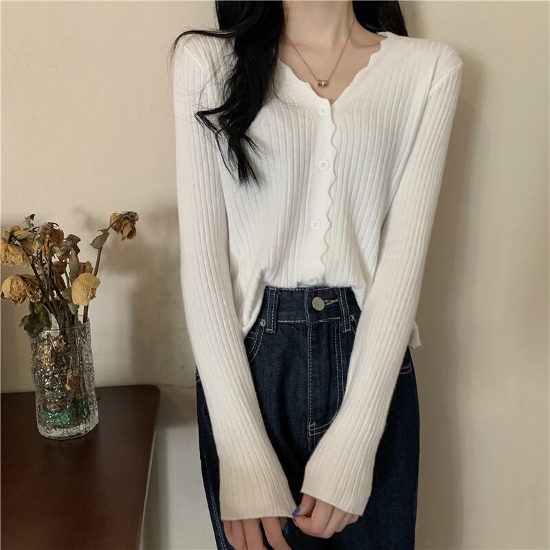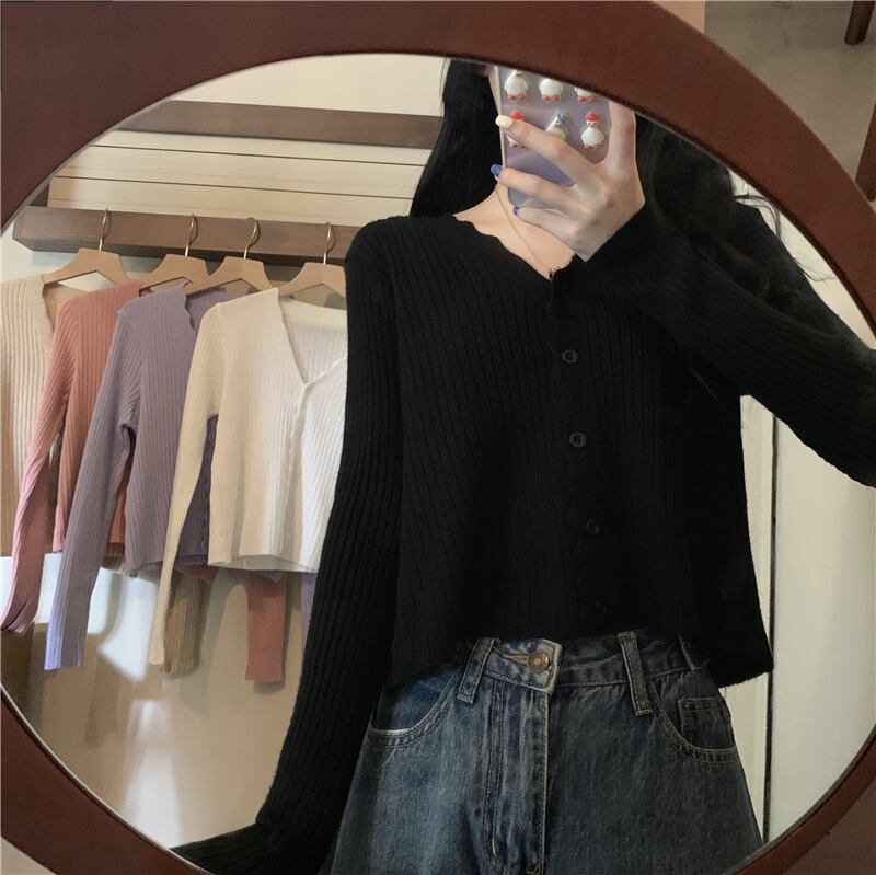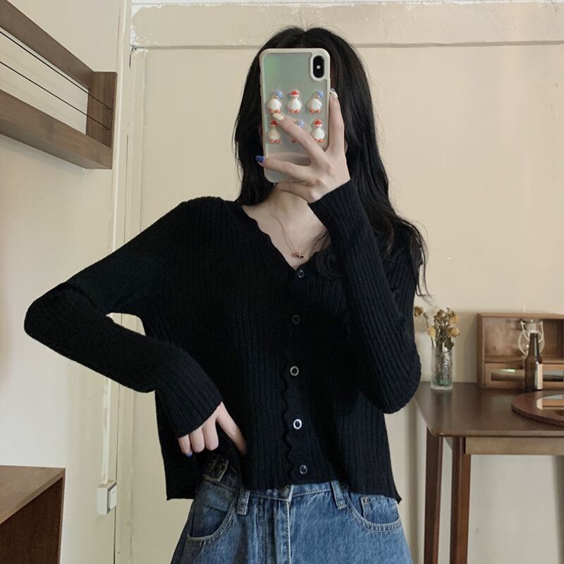 ブラックVネックニットカーディガンスプリング秋物ショートセーター コート トップス ロング 春物 オータム 長袖 SYJ70813760835