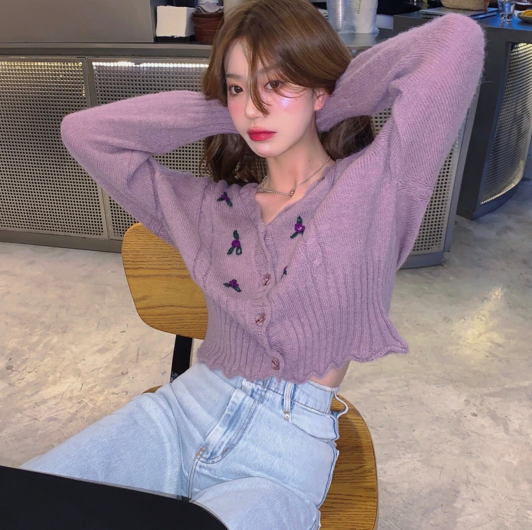 Vネックショートセーター ジャケット スプリング秋物ニットカーディガン 春物 オータム パープル SYJ19413418756