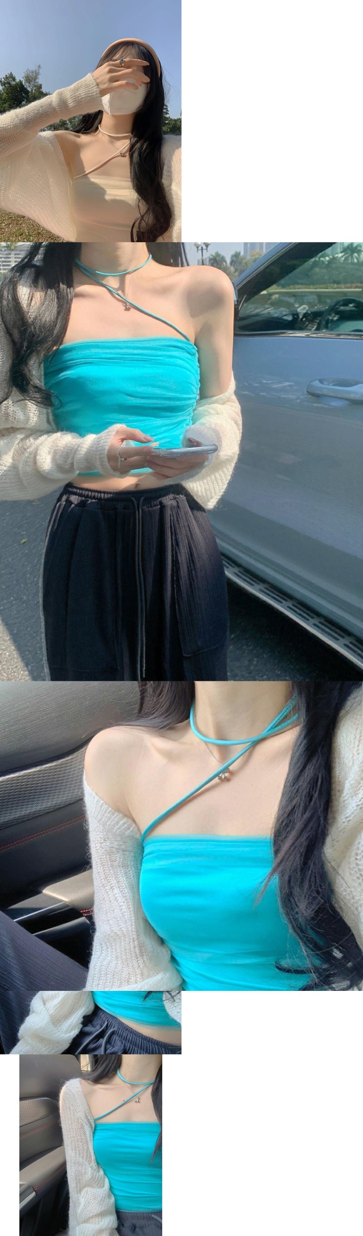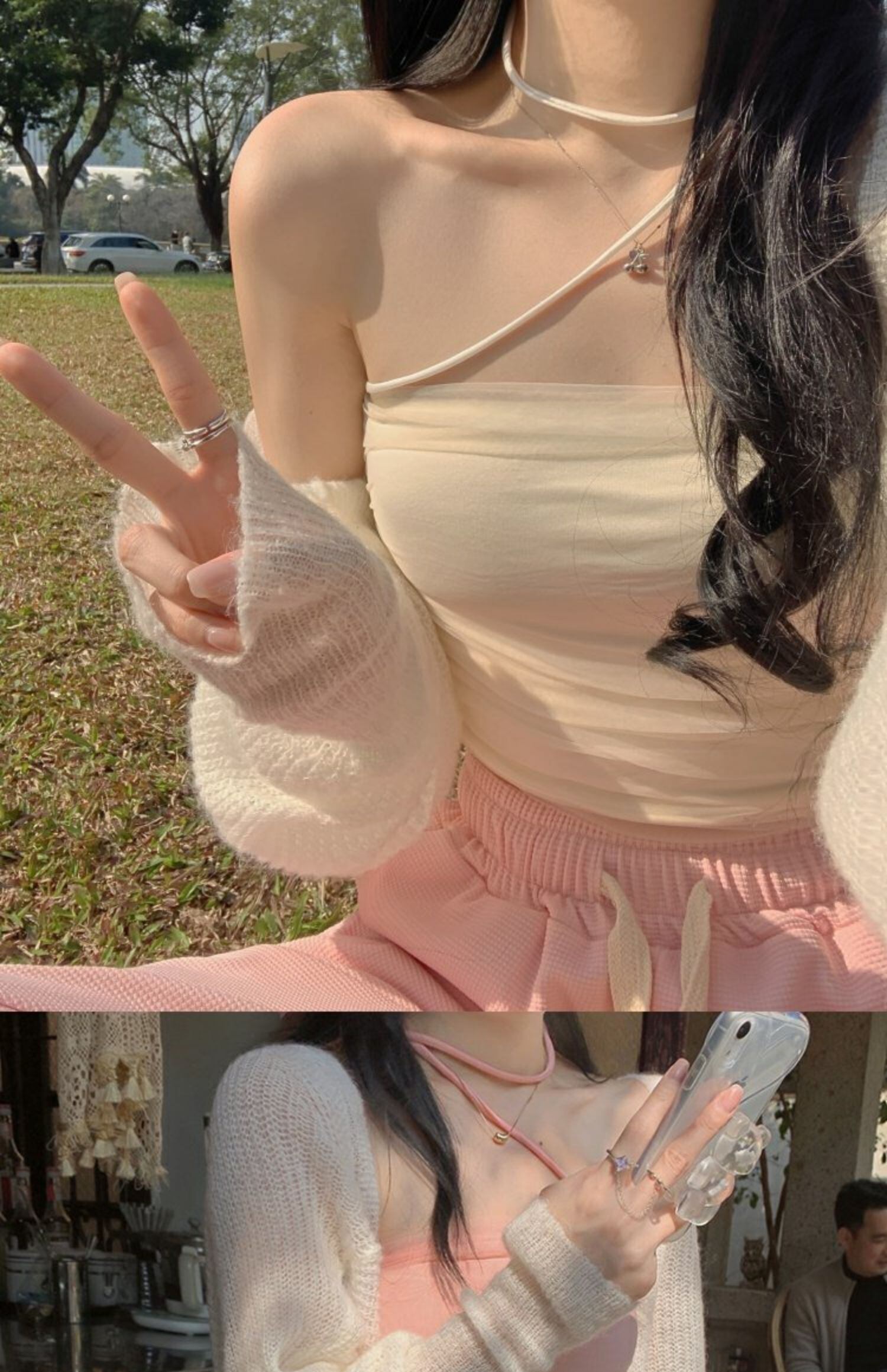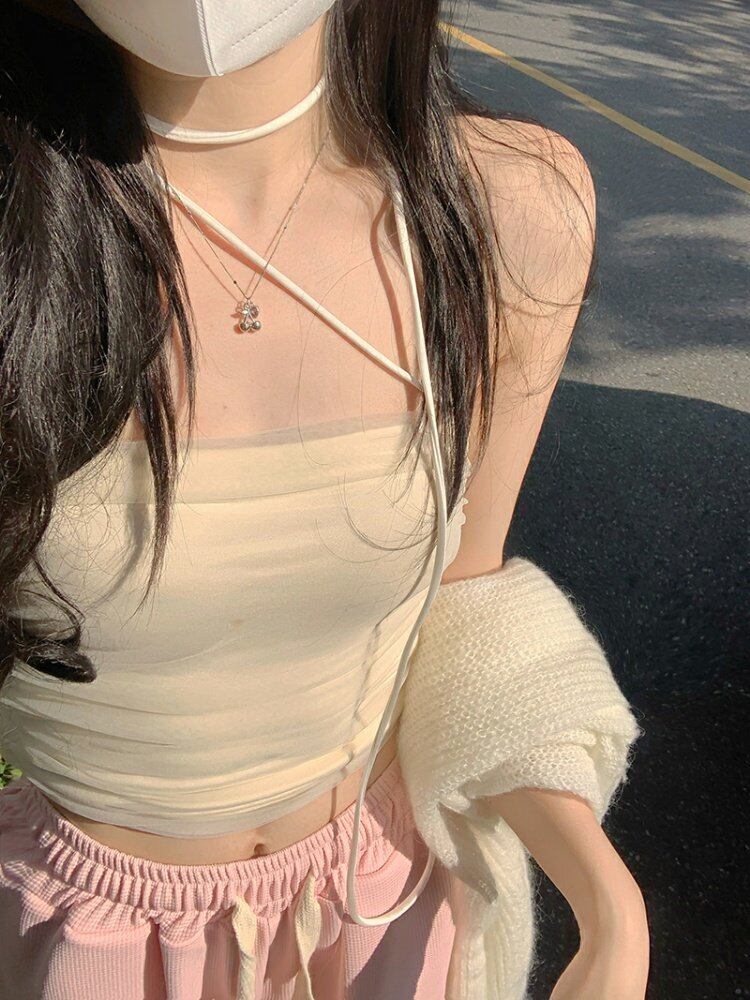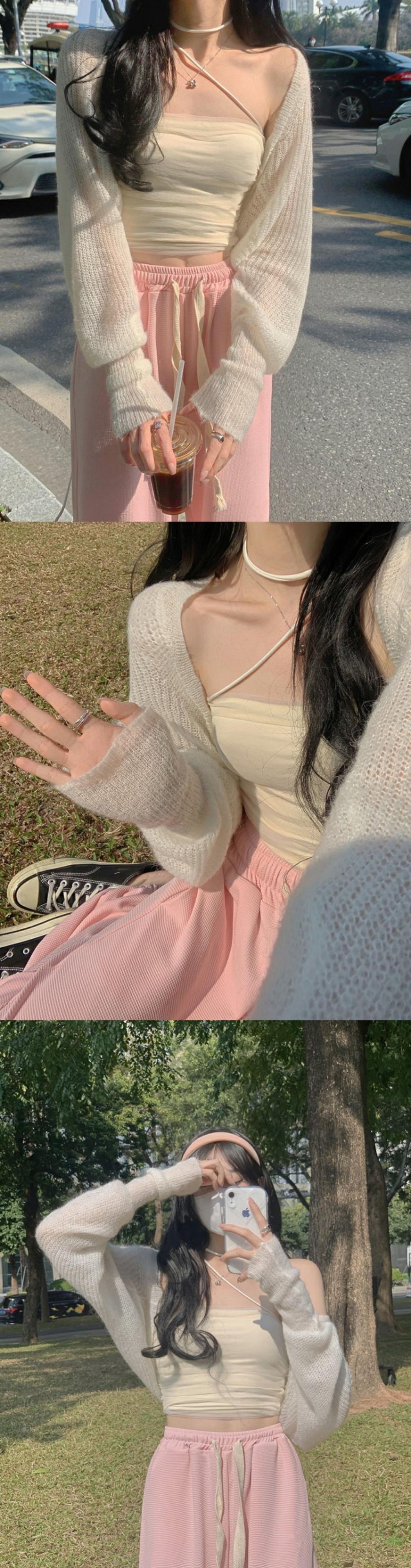 色:ホワイトニットブラウス,ピンクメッシュホルターネックチューブトップ,ネイビーブルーメッシュホルターネックチューブトップ,アプリコットメッシュホルターネックチューブトップ
