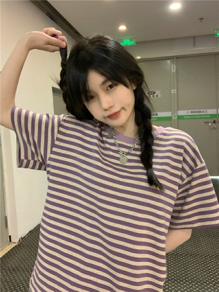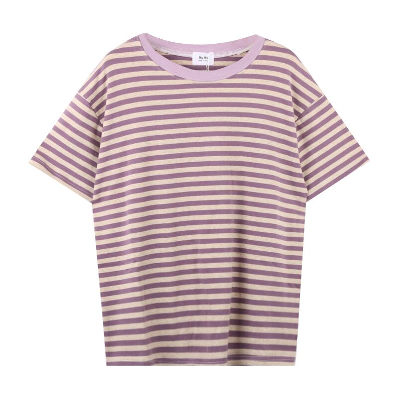 ストライプTシャツ夏服スタンダードルーズ レトロ 夏物 パープル MONROE56031205111