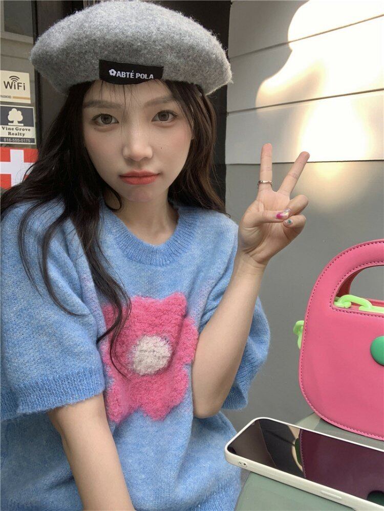 ブルーショートセーター 夏服ニットトップス 大人ガーリー スウィート キュート カジュアル 夏物 MONROE83865679804