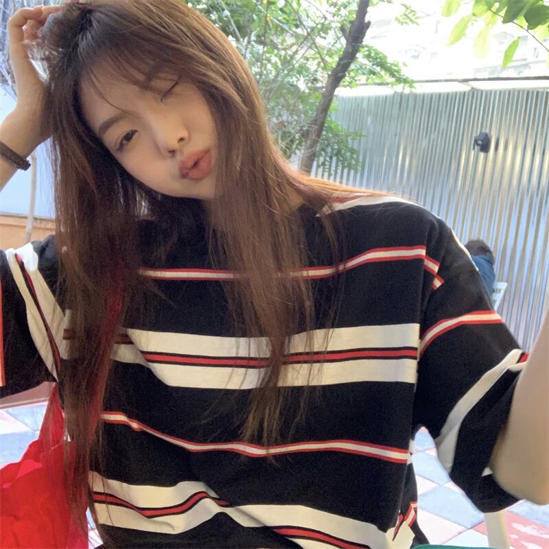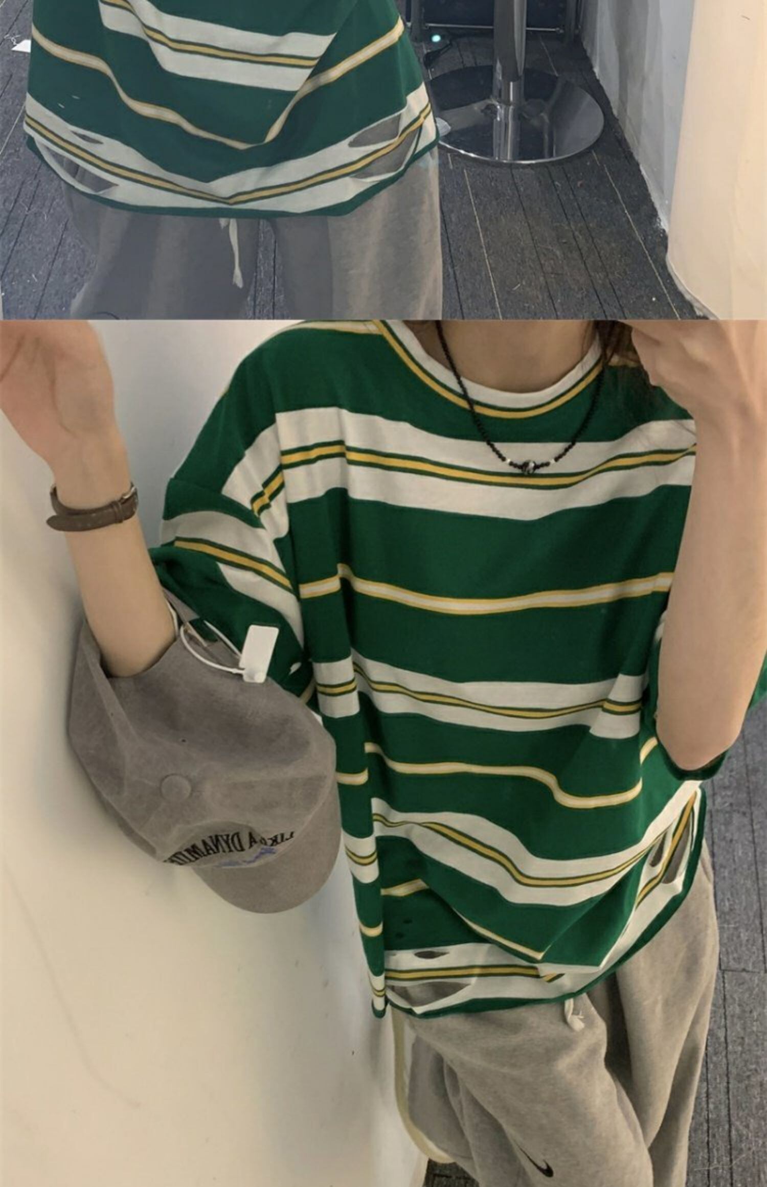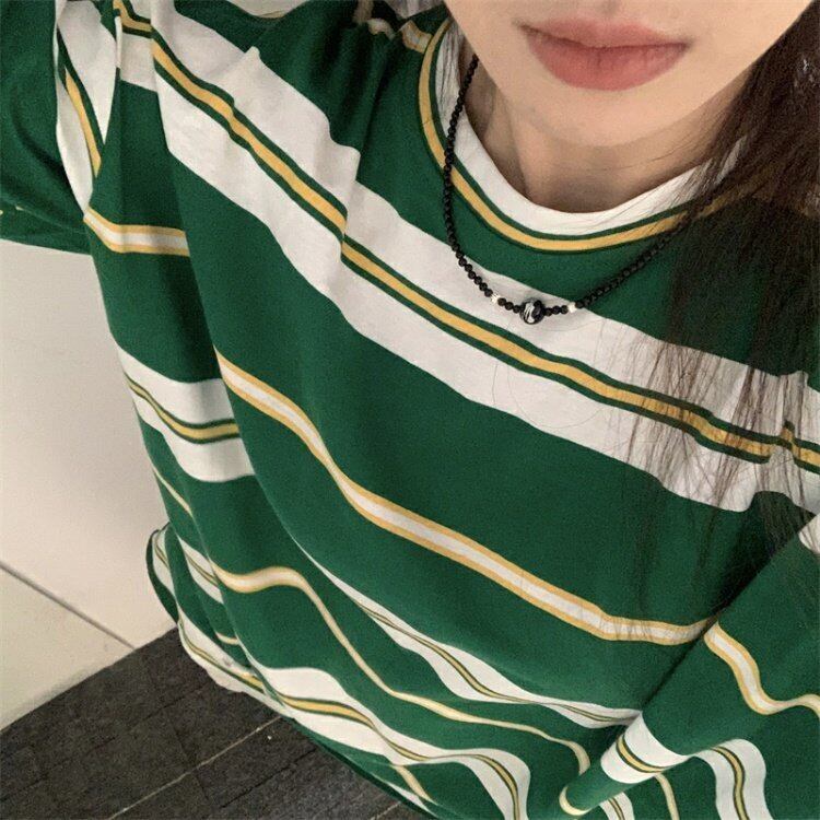 ストライプスタンダードTシャツシャツ ゆったりスプリング薄手プルオーバー トップス レトロ 春物 MONROE58751817414