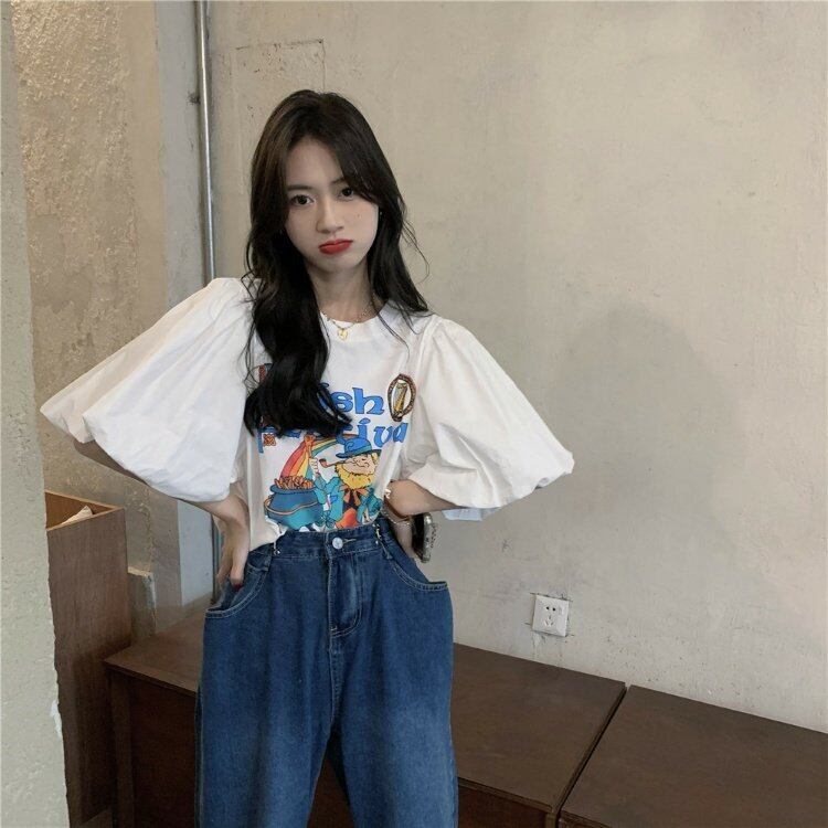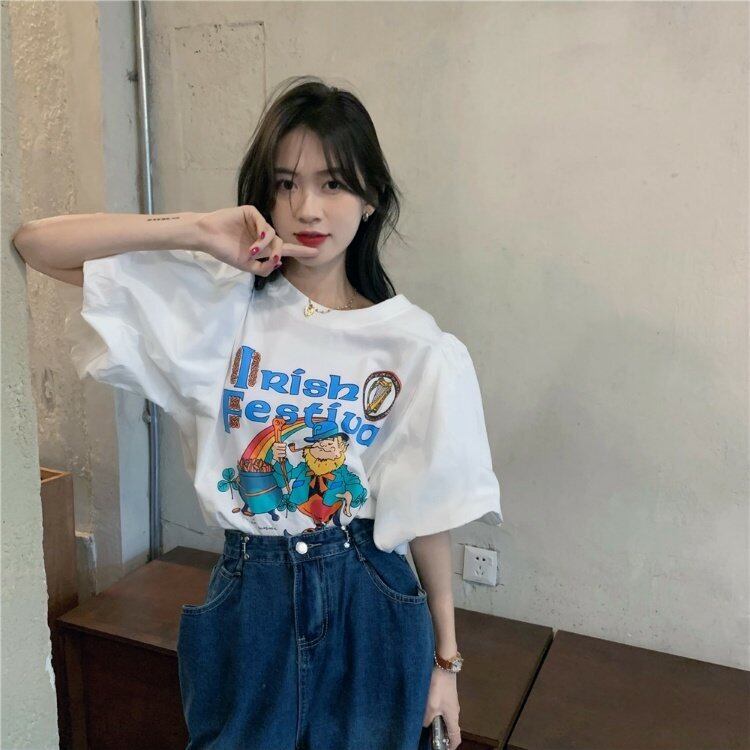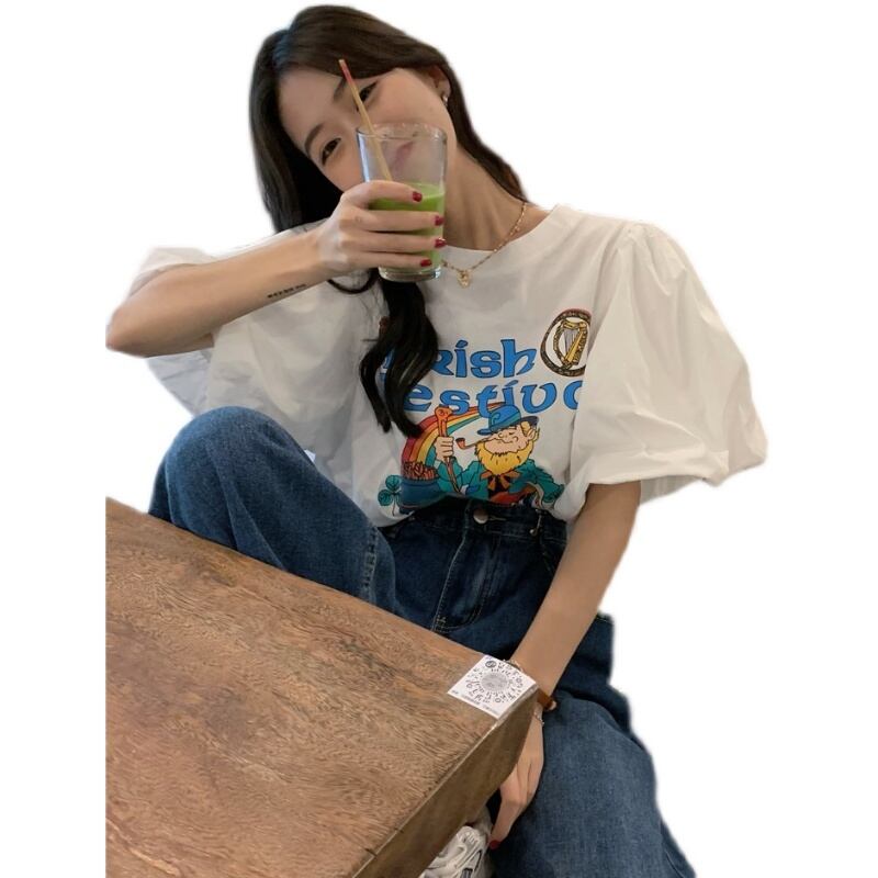韓国ファッションスリーブTシャツシャツ ゆったりスプリングルーズ薄手プリント柄トップス 大人ガーリー スウィート キュート カジュアル 春物 MONROE21370609505
