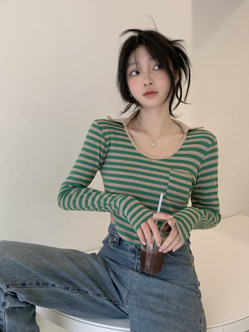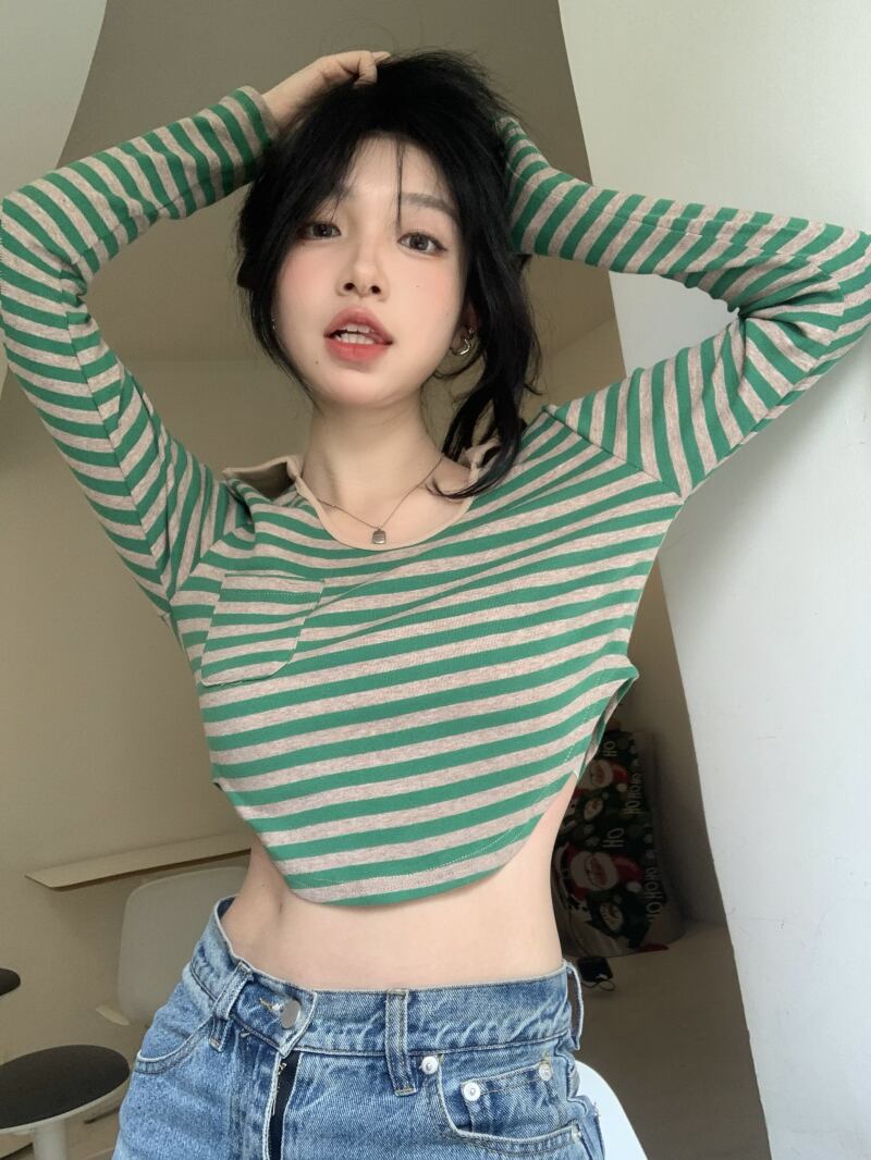 クロップドショートトップス スプリングストライプ長袖スリーブTシャツ ロング 大人ガーリー スウィート キュート カジュアル 春物 MONROE92411446564