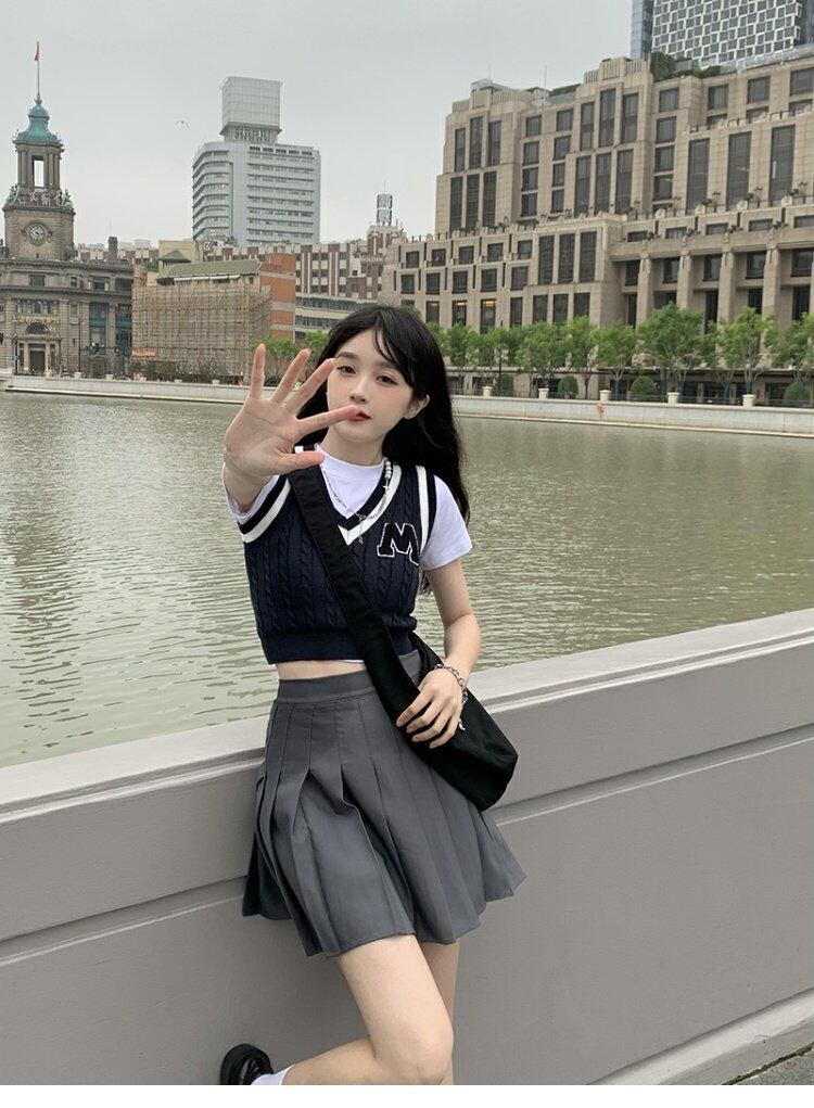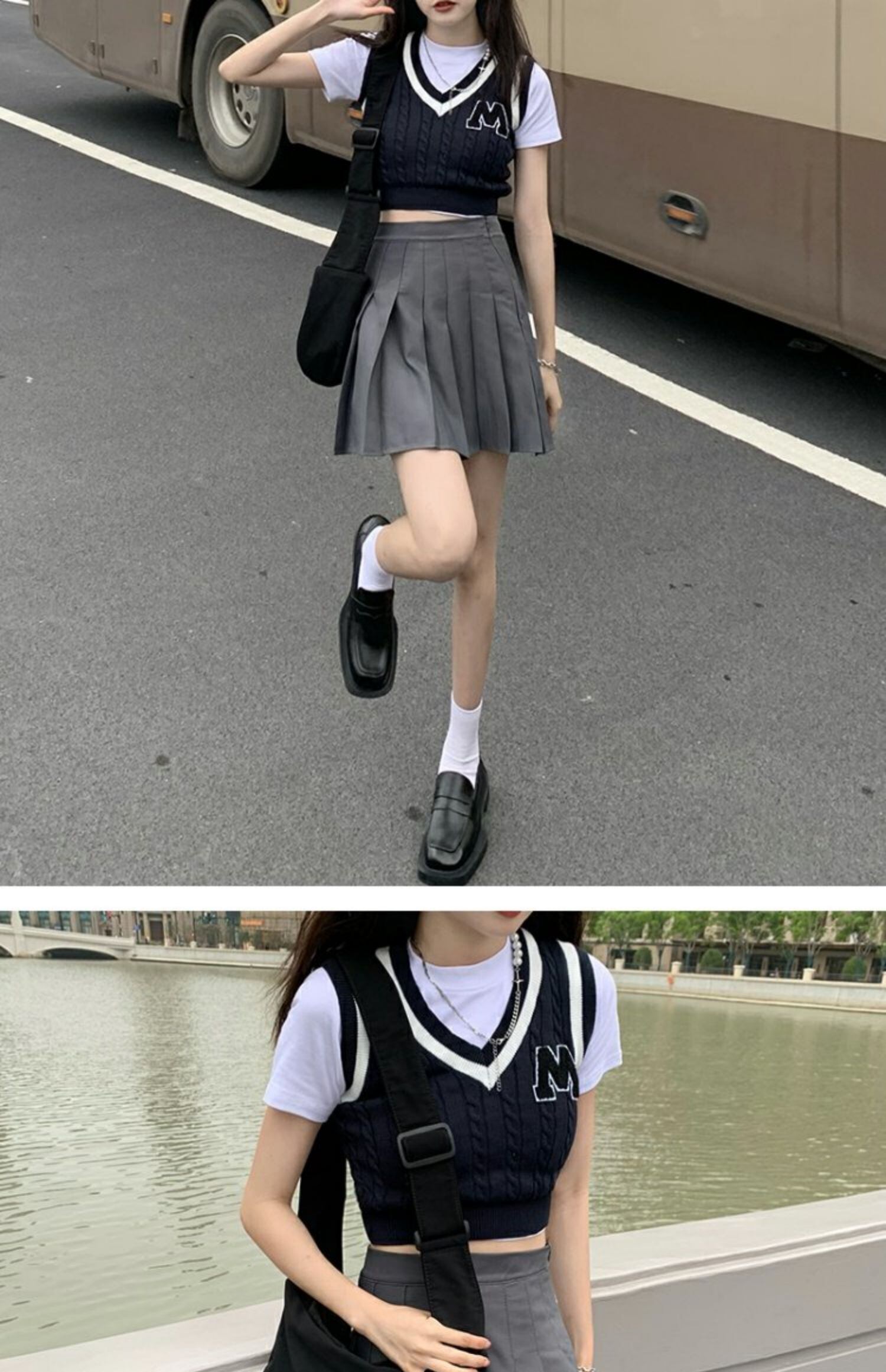 色:ホワイトショートT,ネイビーブルーベスト,グレープリーツスカート