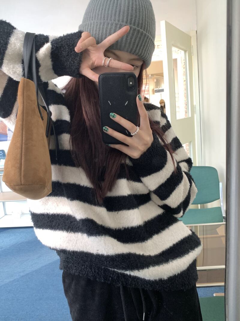 韓国ファッションスタイルストライプニットセーター ジャケット 秋物ウィンタールーズトップス オータム 冬物 ミドル丈 MONROE15601705169