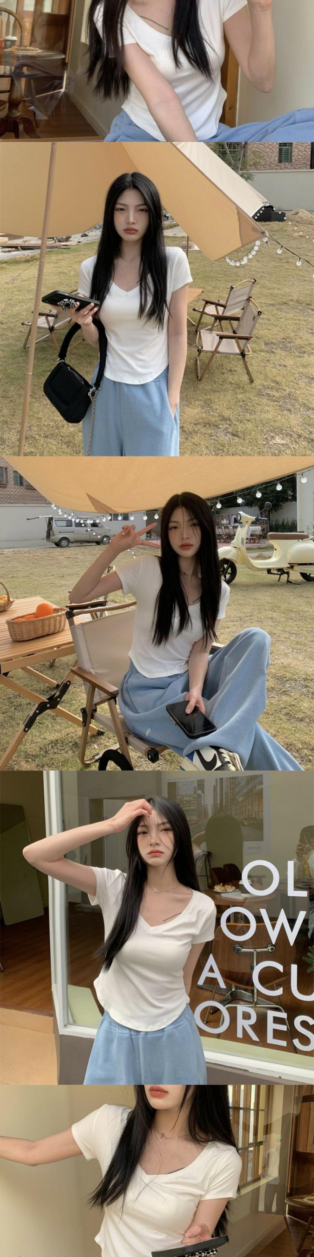 グリーンショートTシャツ夏服スリムVネックトップス 大人ガーリー スウィート キュート カジュアル 夏物 MONROE53151625736