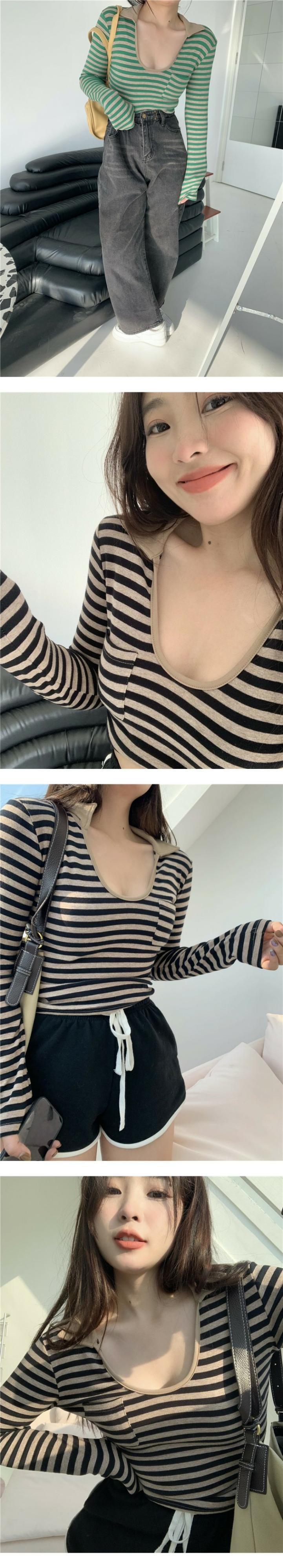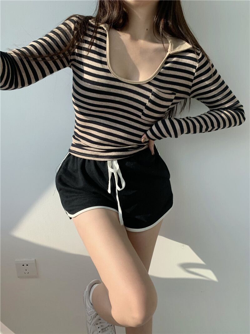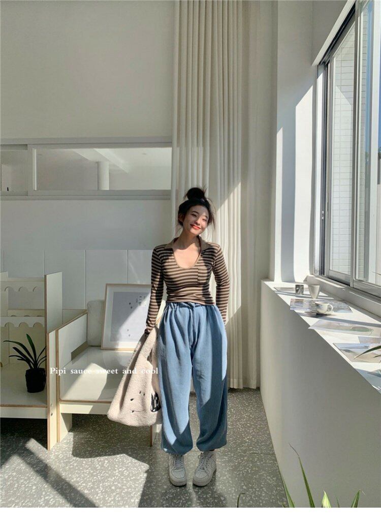 韓国ファッションストライプスタンダードカラーTシャツシャツ スプリング秋物スタイル薄手ゆったりトップス レトロ 春物 オータム MONROE91528385131
