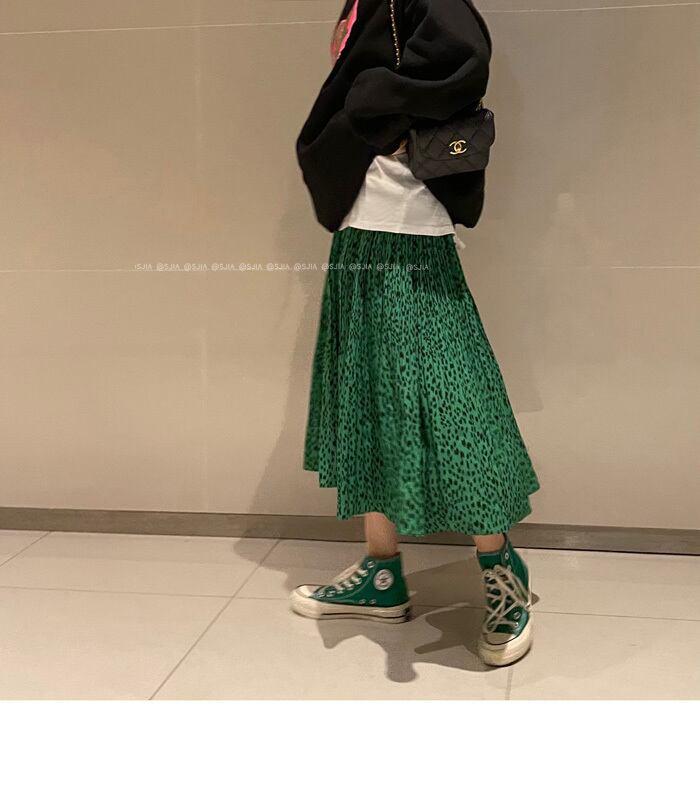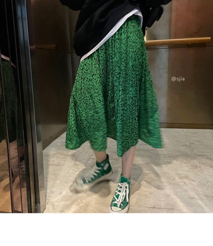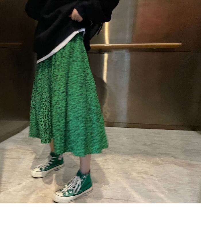 グリーンレオパードプリント柄ハイウェストウェストスカート 秋物プリーツロング オータム ウエスト MONROE81859871776
