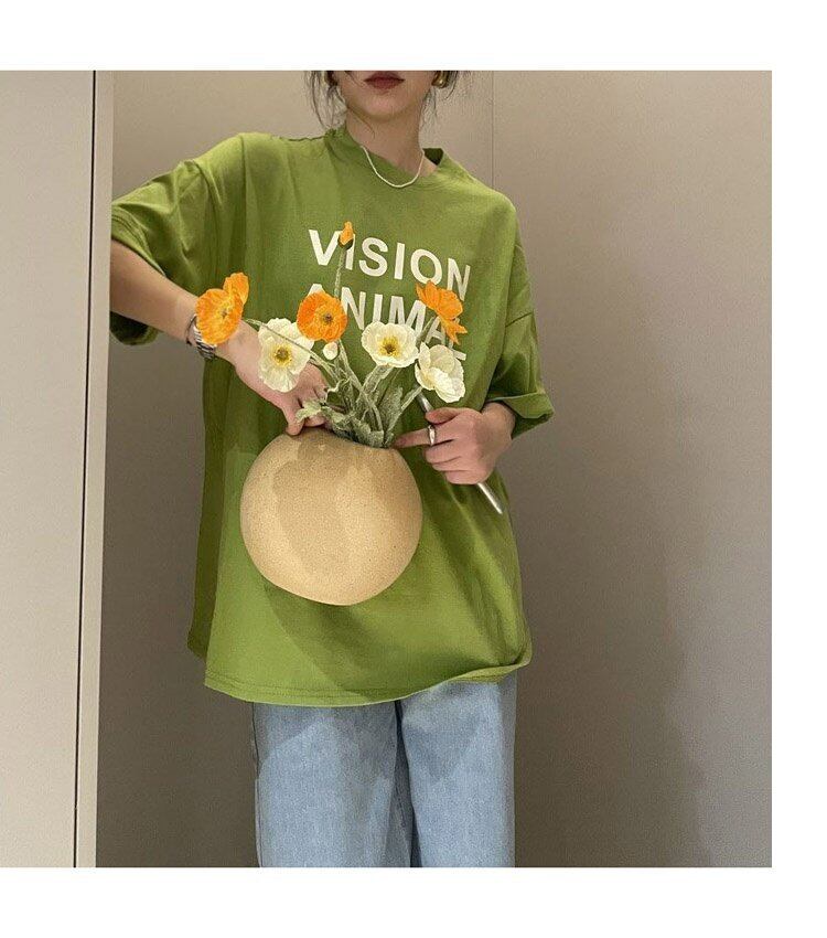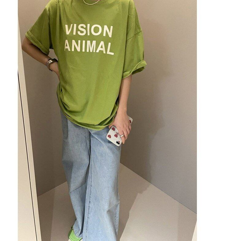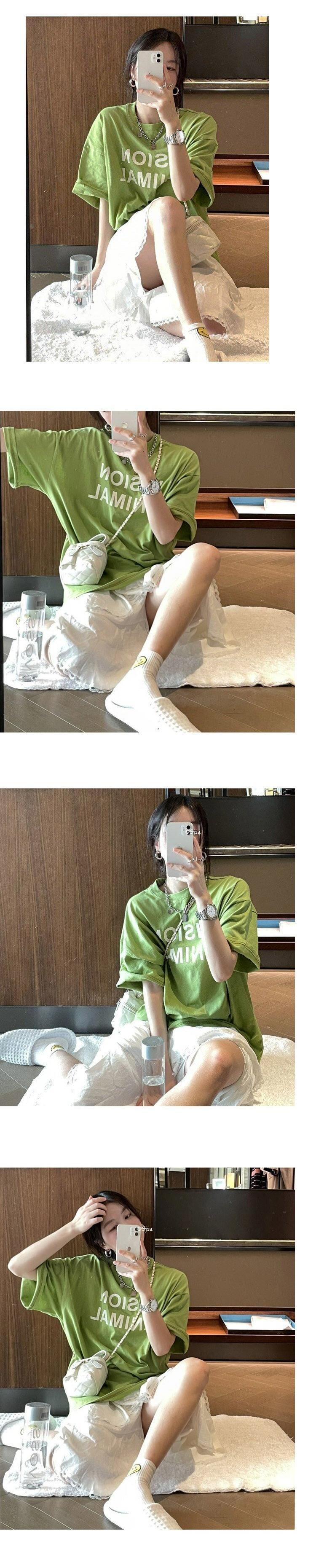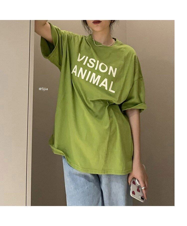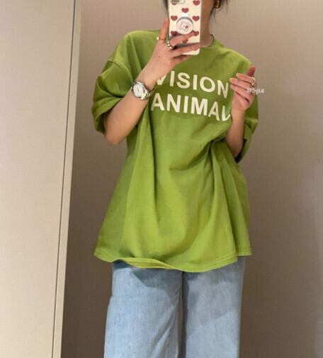 グリーンプリントラウンドネックTシャツシャツ スプリングルーズ薄手ゆったりトップス 春物 Oネック MONROE84501297855