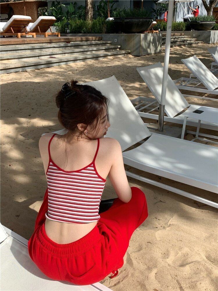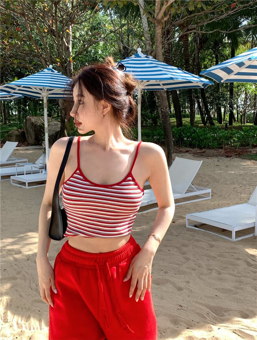 レッドストライプ夏服ゆったりトップス 大人ガーリー スウィート キュート カジュアル 夏物 ピュア MONROE78122671796