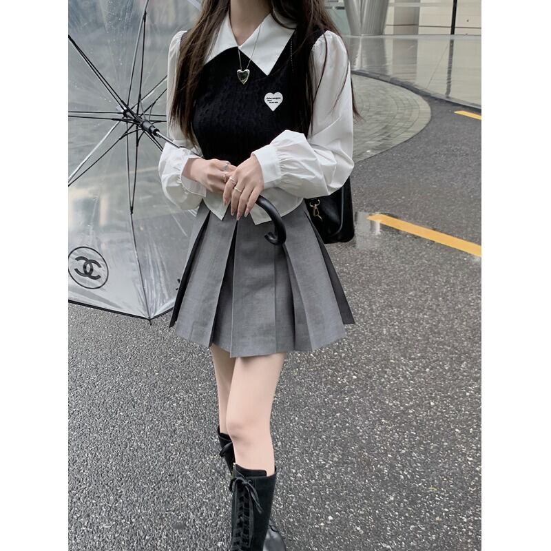 色:淡黄色,ステッチトップ12066,グレーのプリーツスカート12080