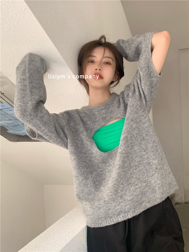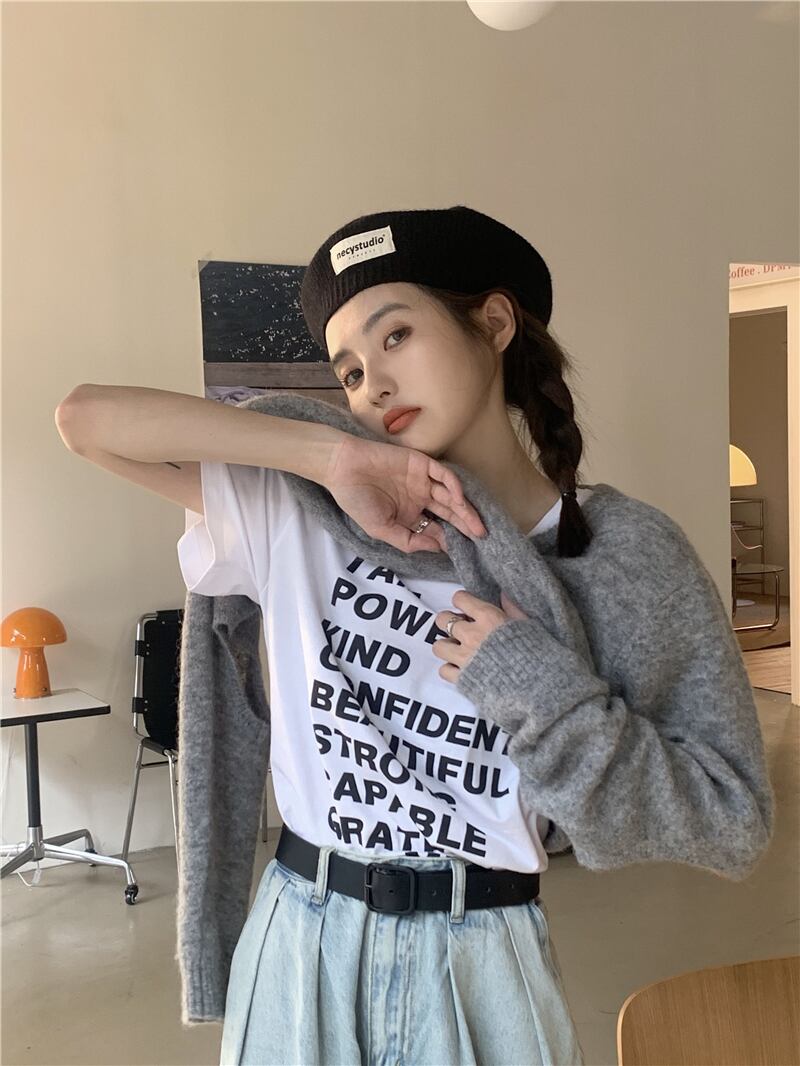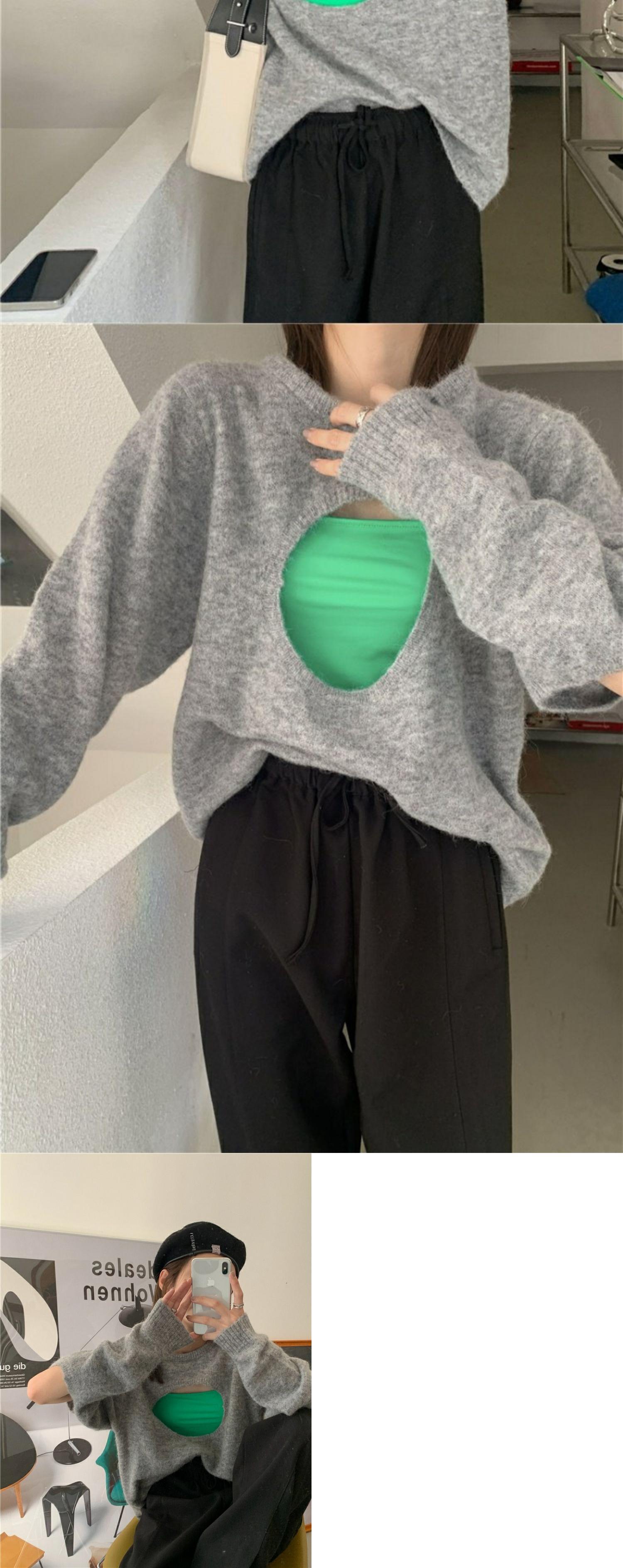 色:グレーのセーター,グリーンスリング,白いTシャツ