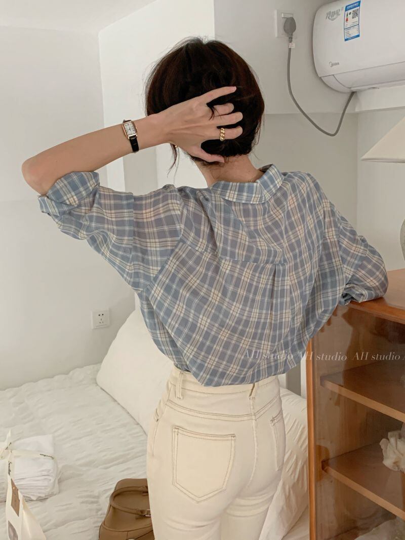色:ブルーチェック柄日焼け止めシャツ,緑の格子縞の日焼け止めシャツ