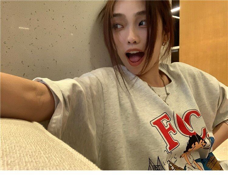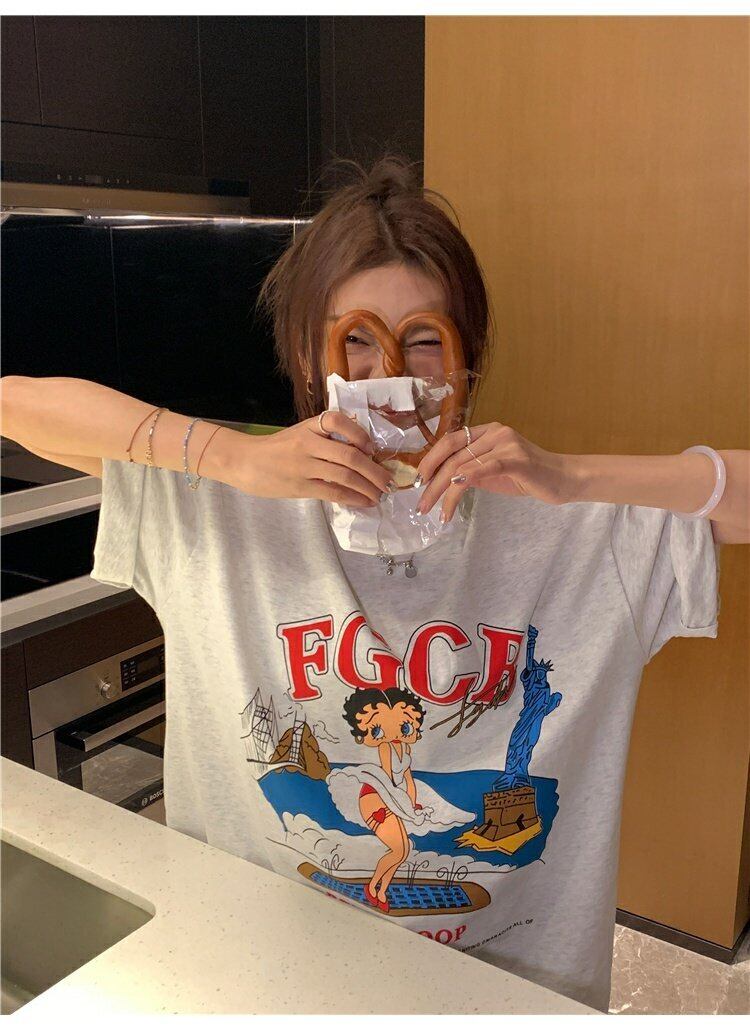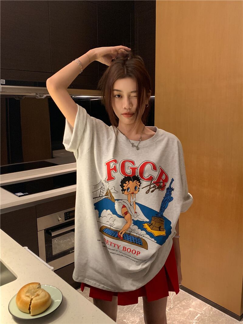 スタンダードTシャツスプリングプリント柄ルーズNEWスタイルショート レトロ 半袖 ハーフスリーブ 春物 ミドル丈 MONROE47571105582