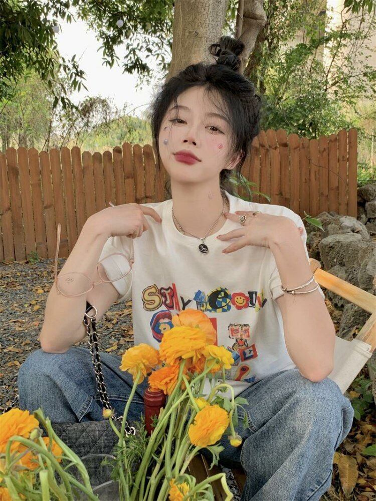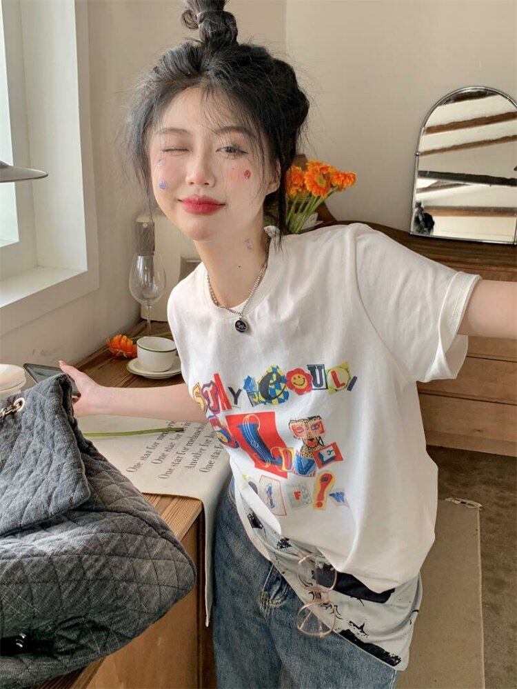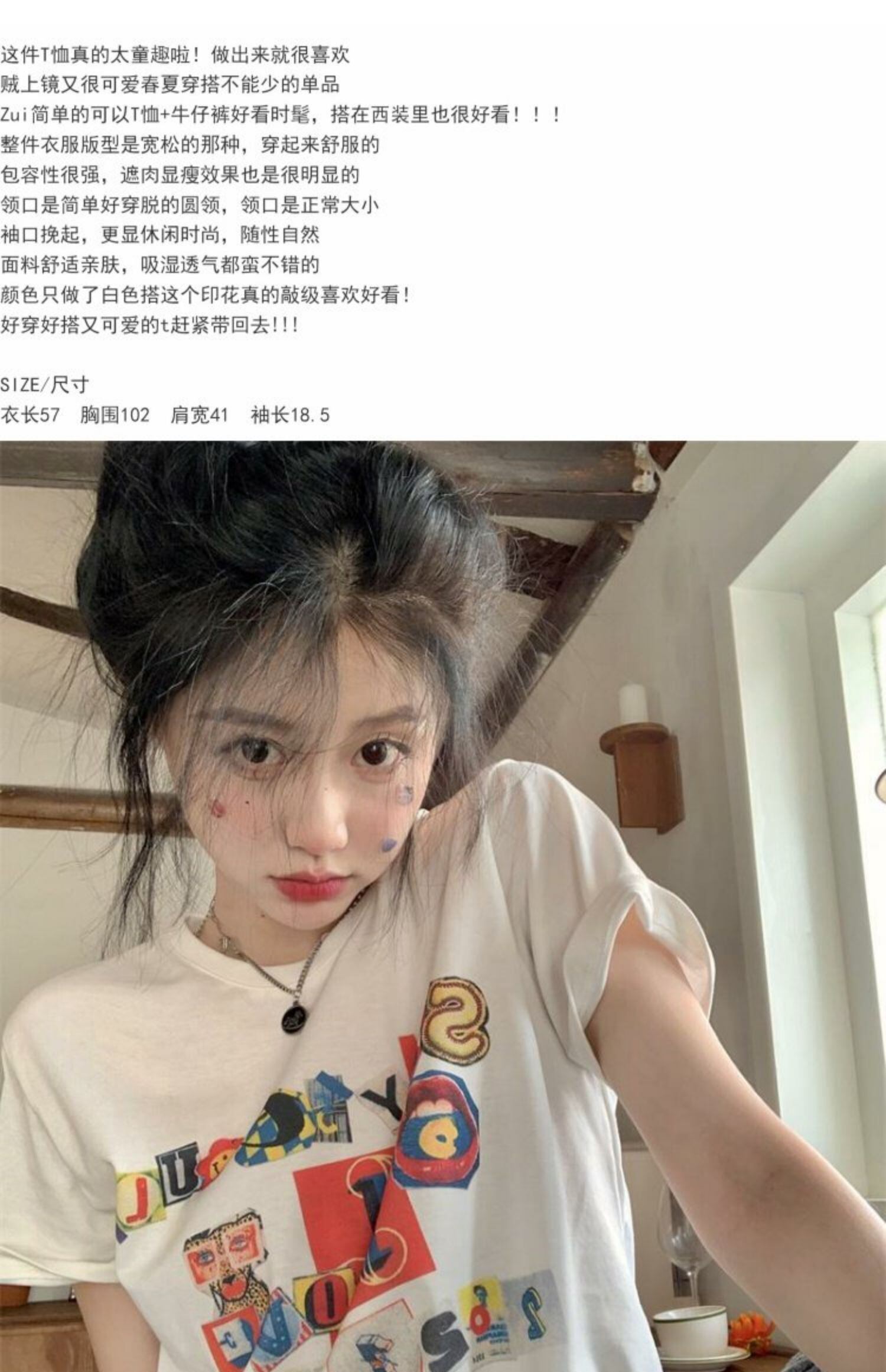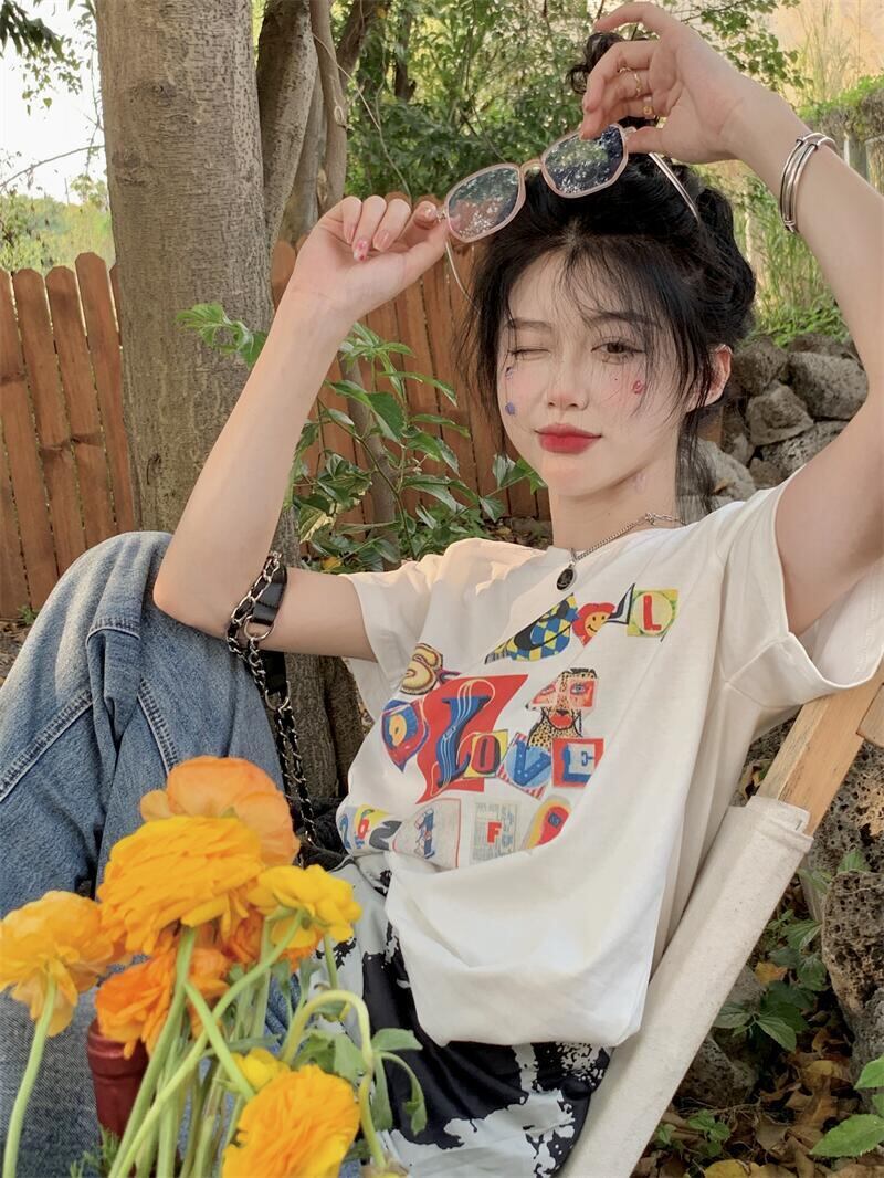 パターンプリントホワイトショートTシャツ夏服ゆったりトップス 夏物 MONROE86305865521