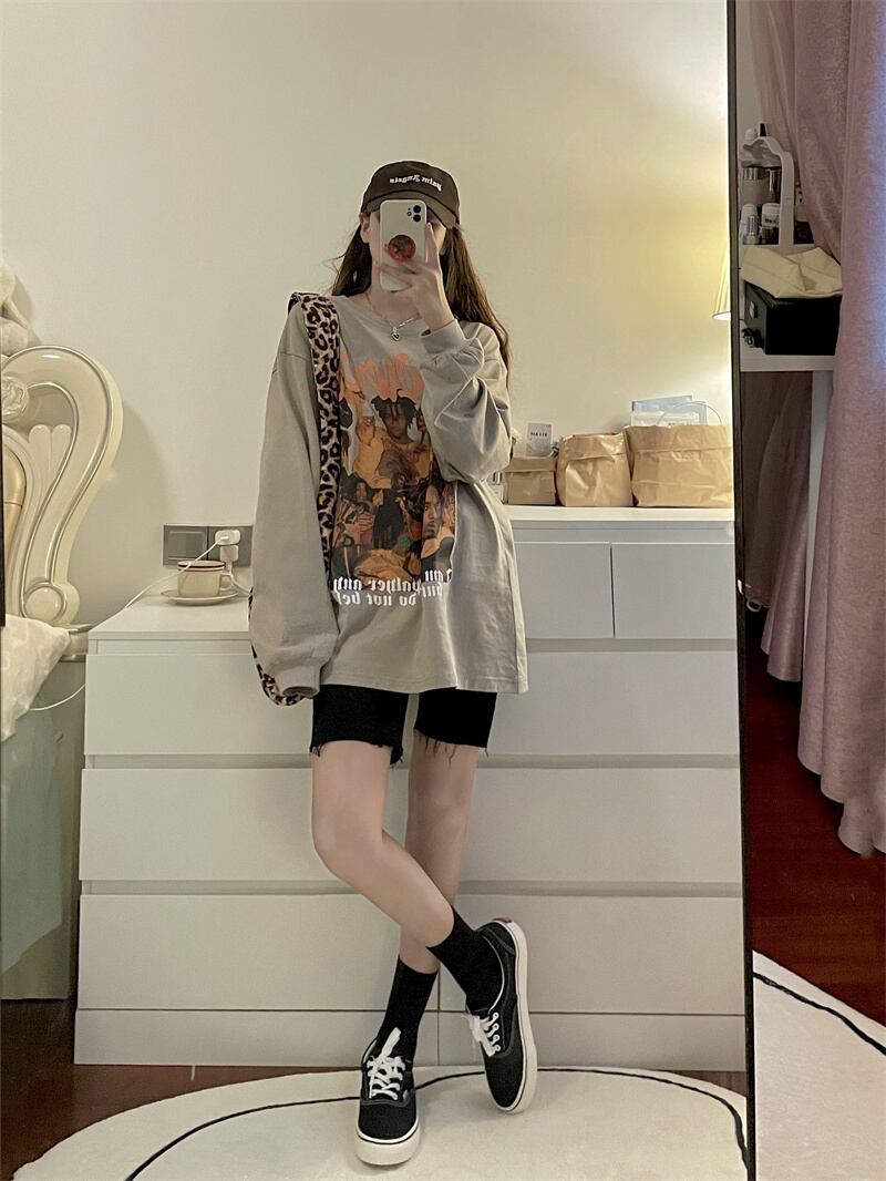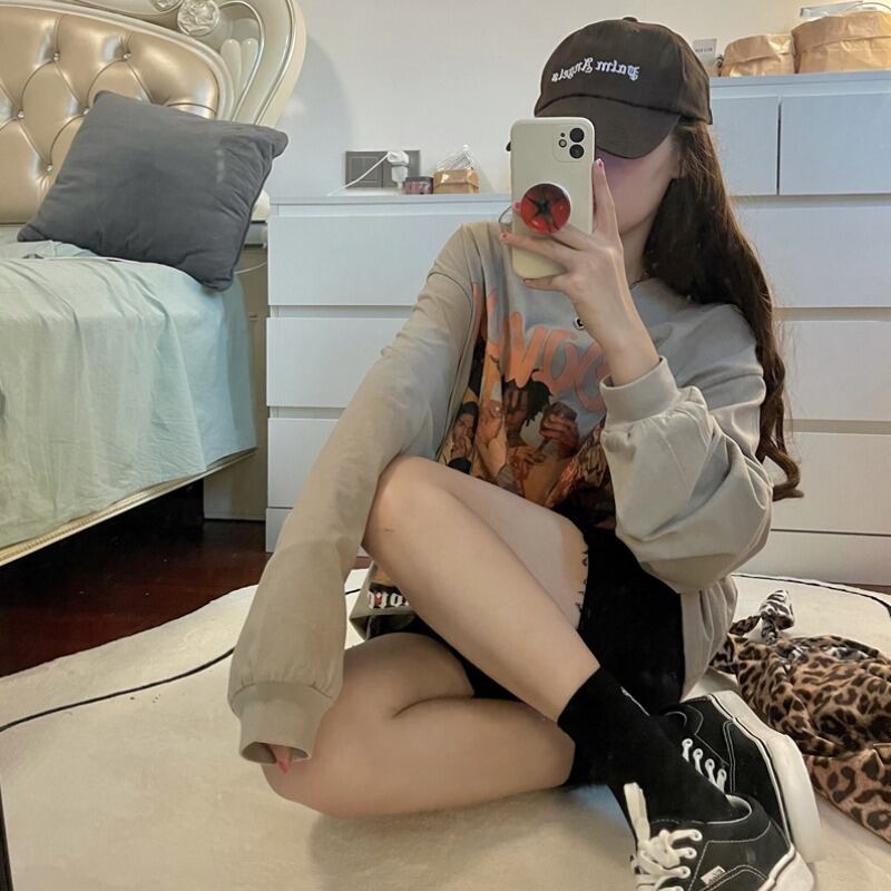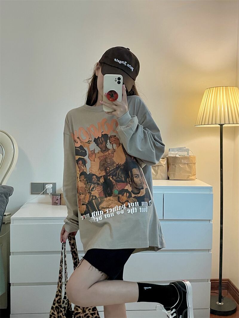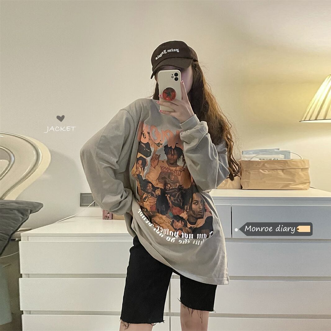 スタンダードルーズTシャツシャツ 秋物薄手ゆったりトップス NEW ロング レトロ オータム 長袖 MONROE47340966608