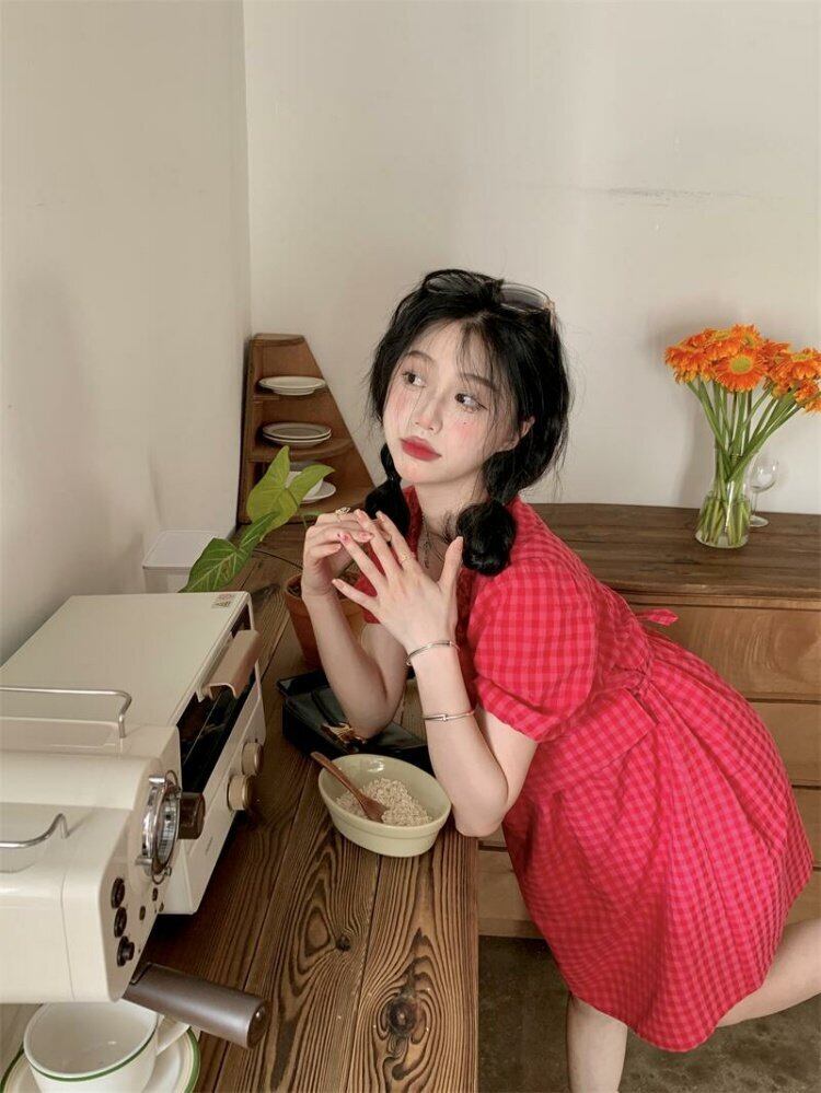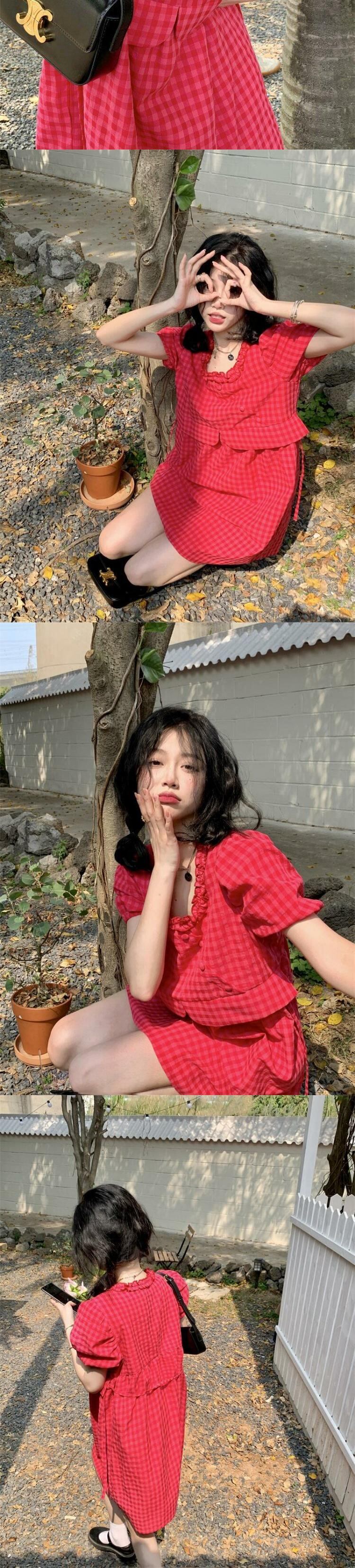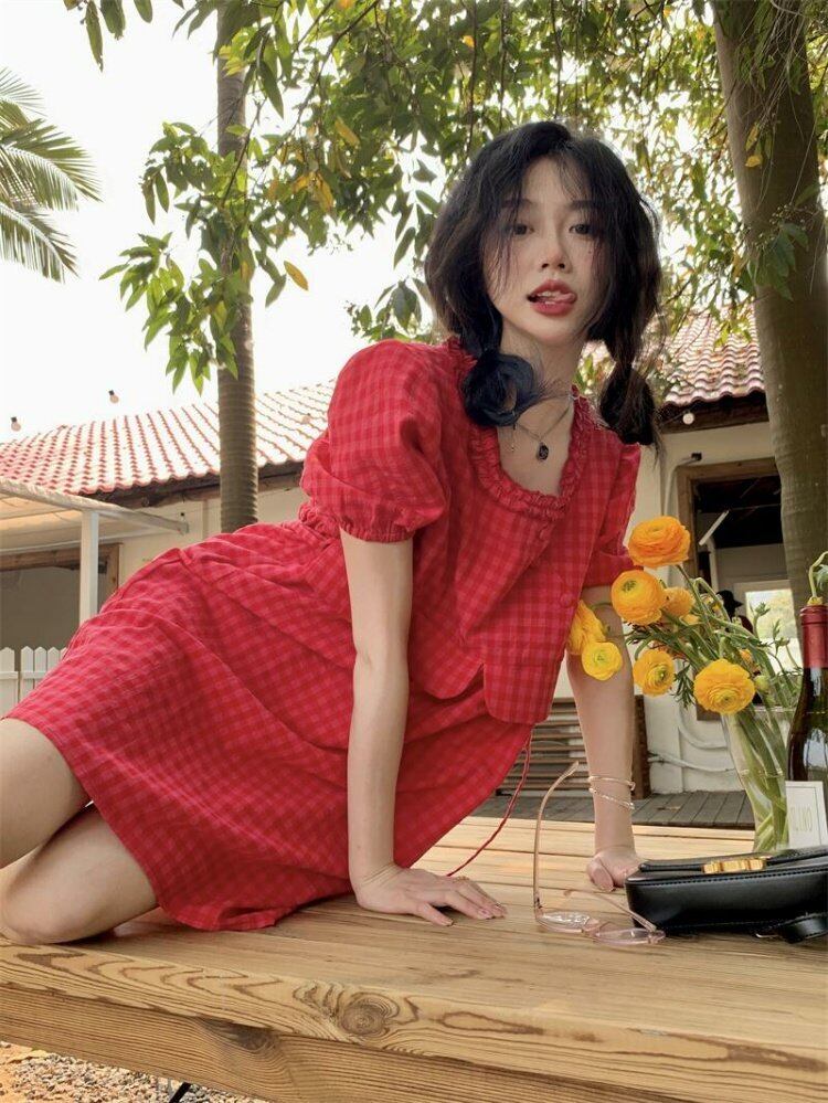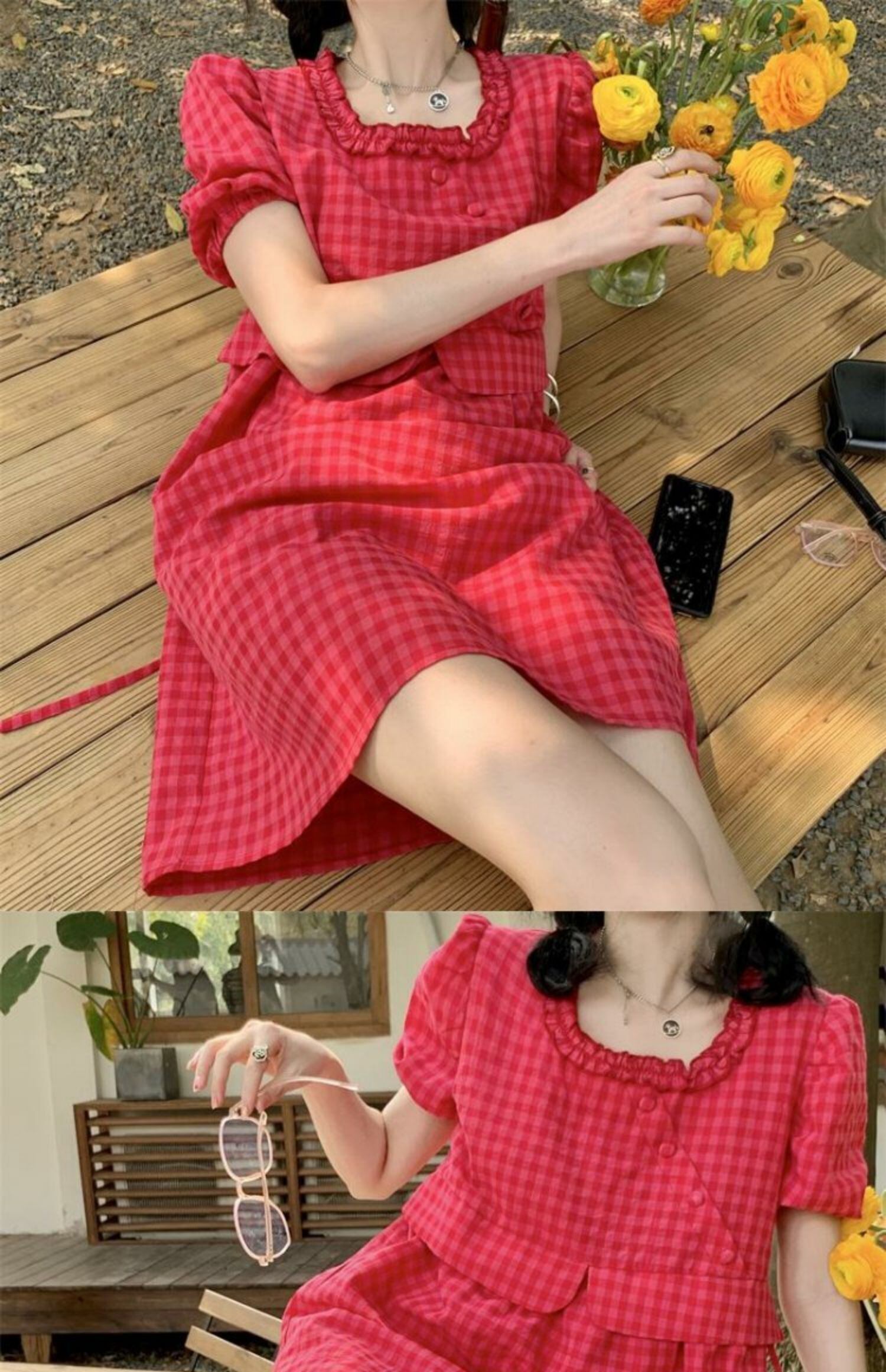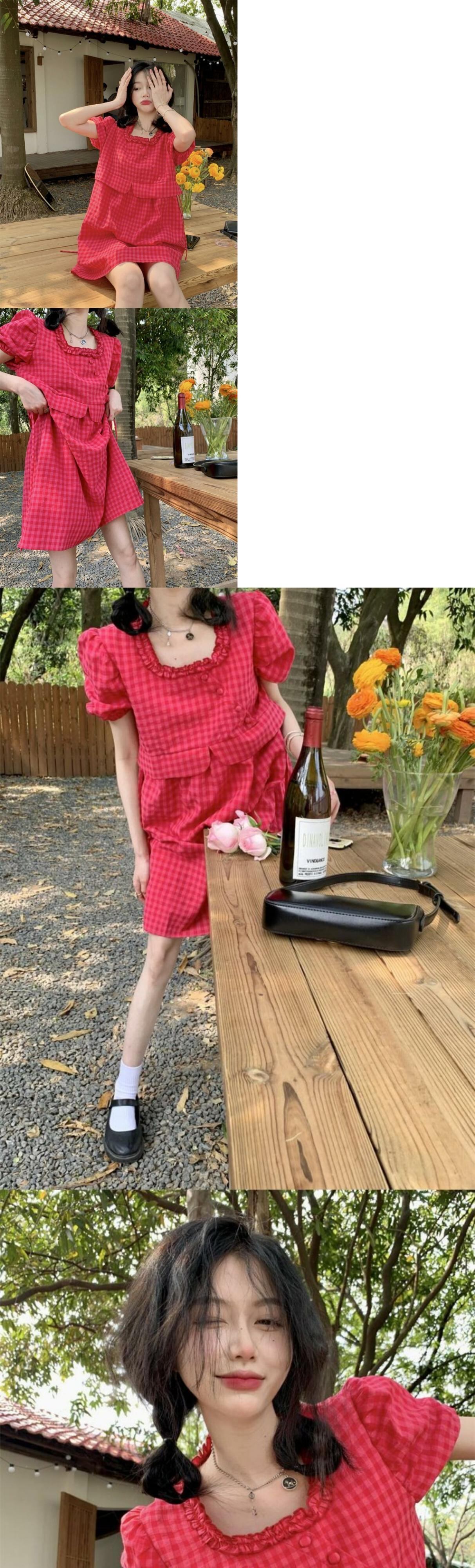 ワンピースレッド格子柄スカート 夏服ルーズショート 夏物 スクウェア MONROE25310475449