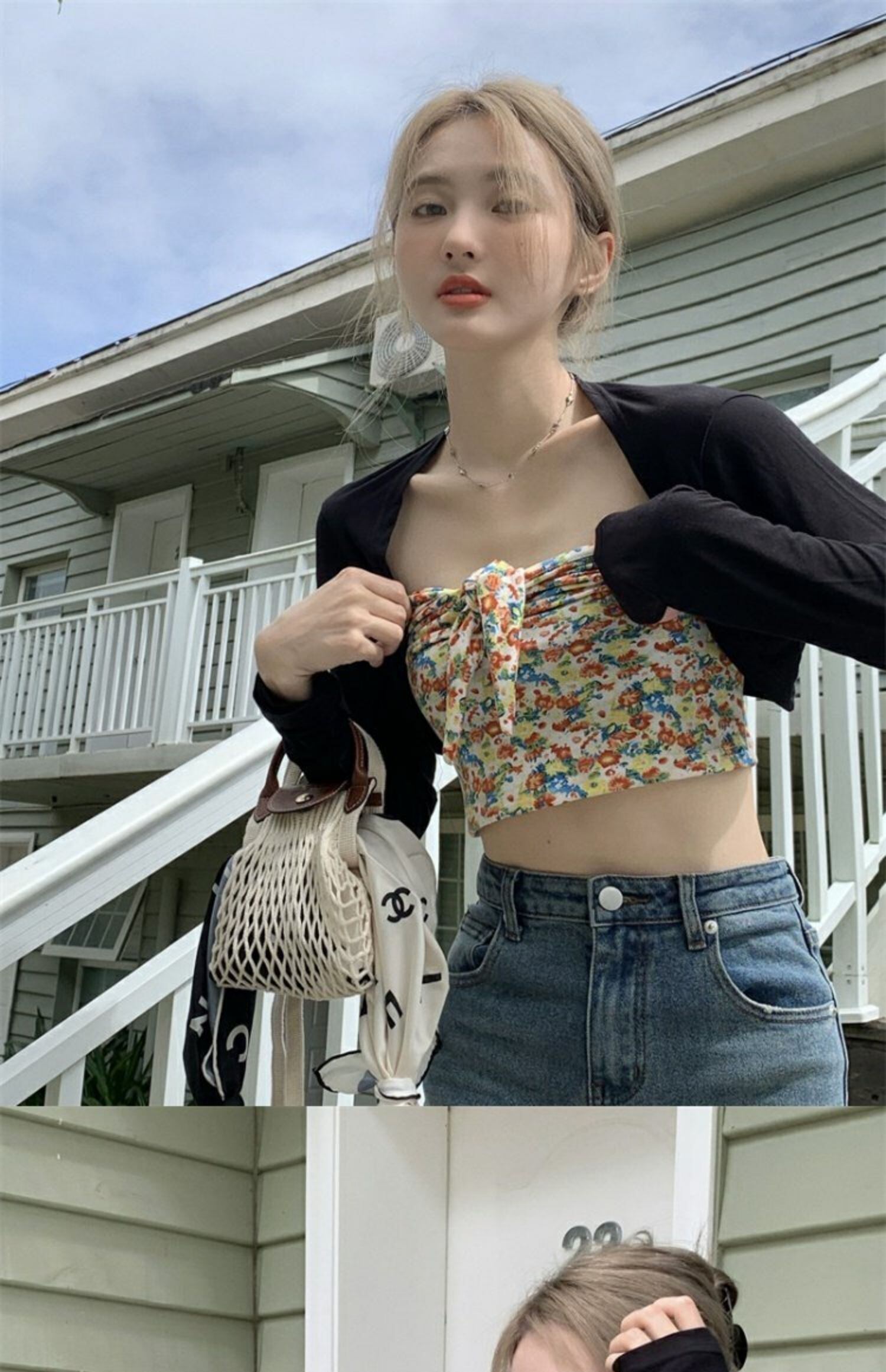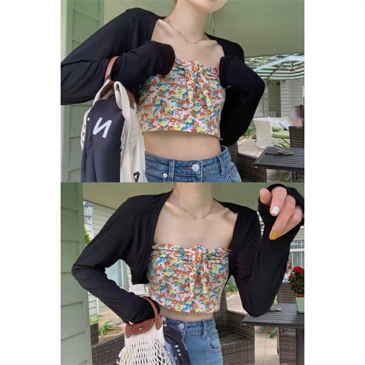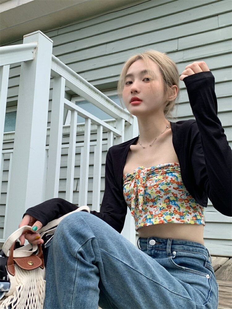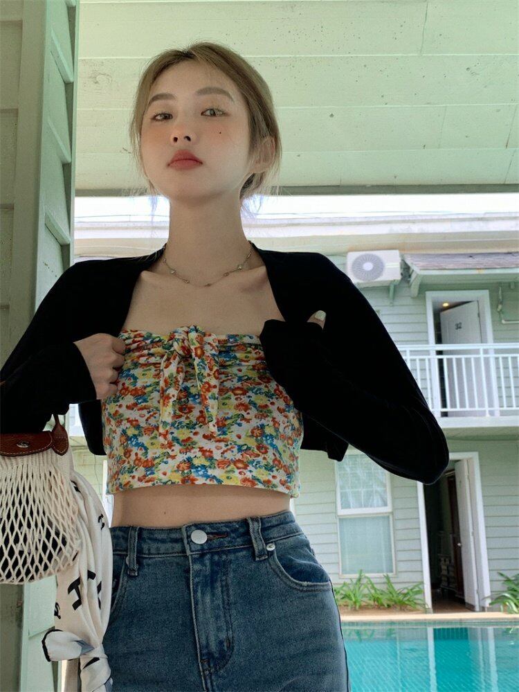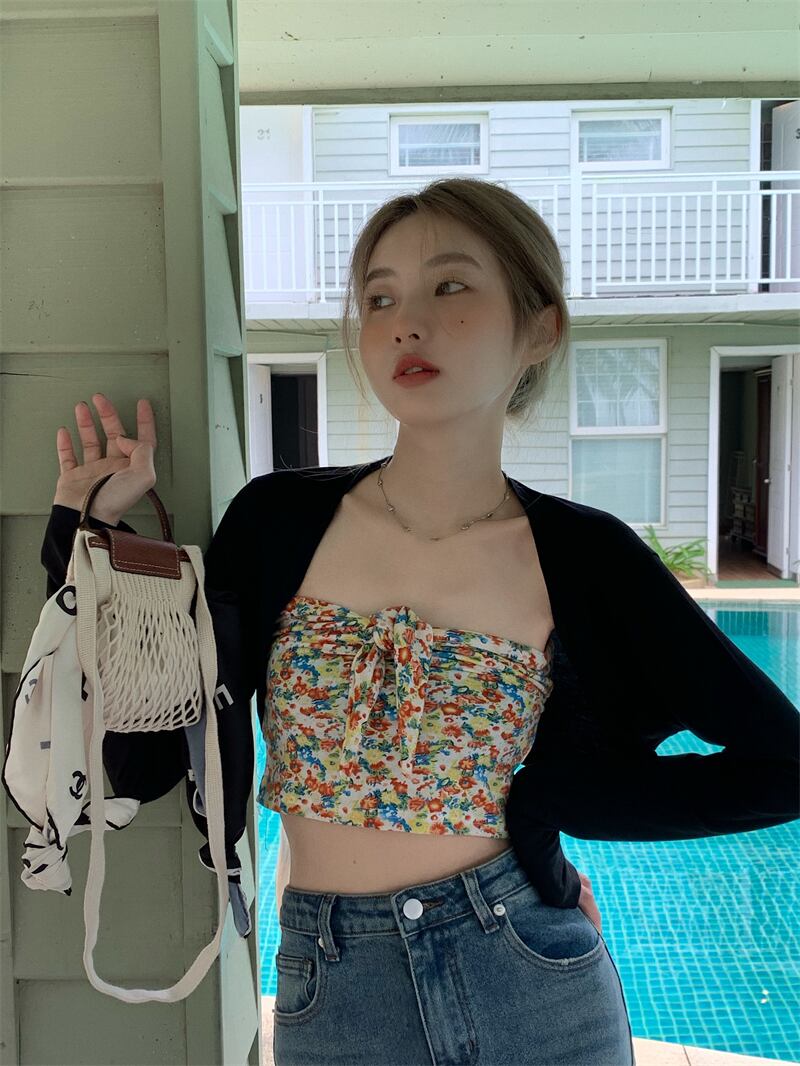 色:フローラルチューブトップ,ブラックカーディガン