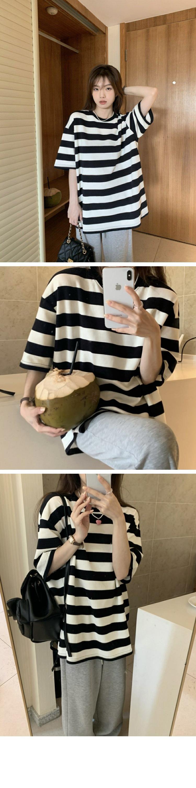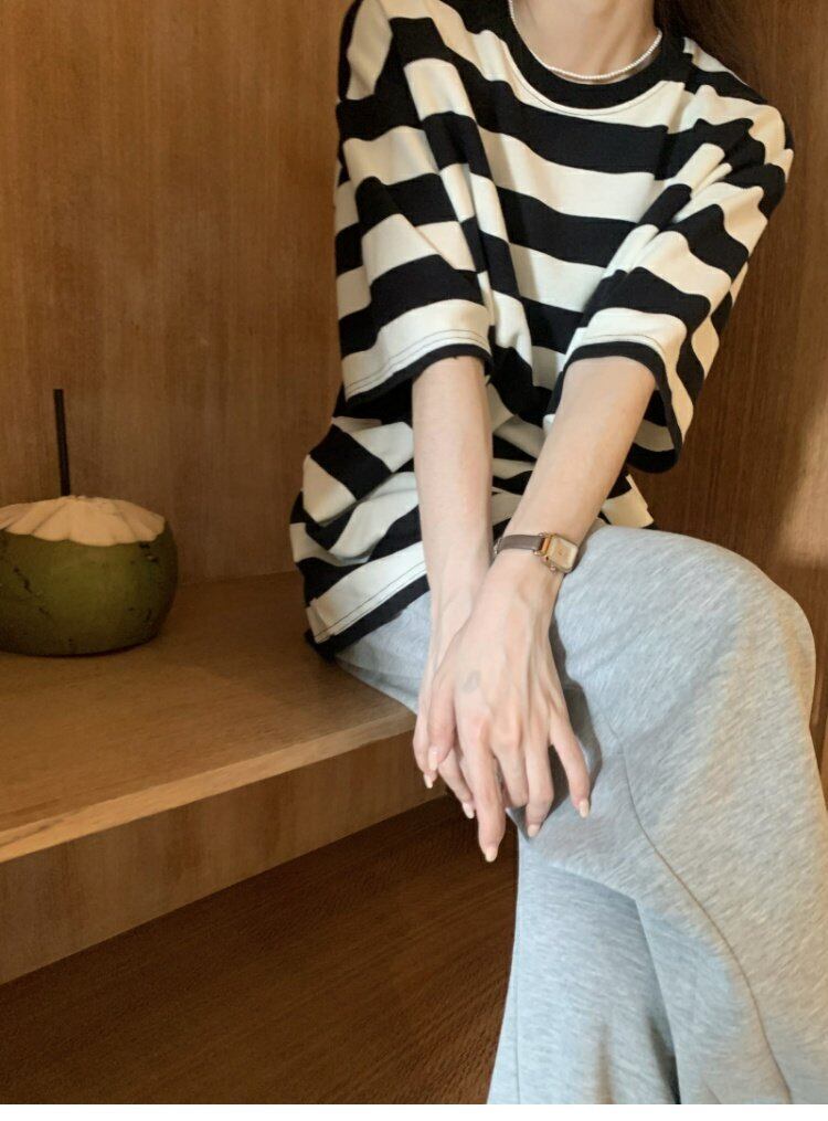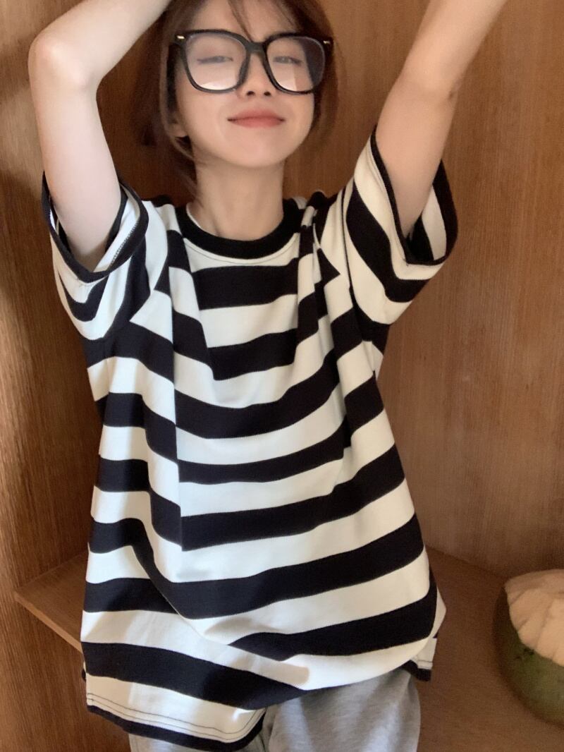 ストライプ半袖スリーブTシャツシャツ ゆったりスプリングトップス ショート ハーフスリーブ 春物 MONROE16051643172